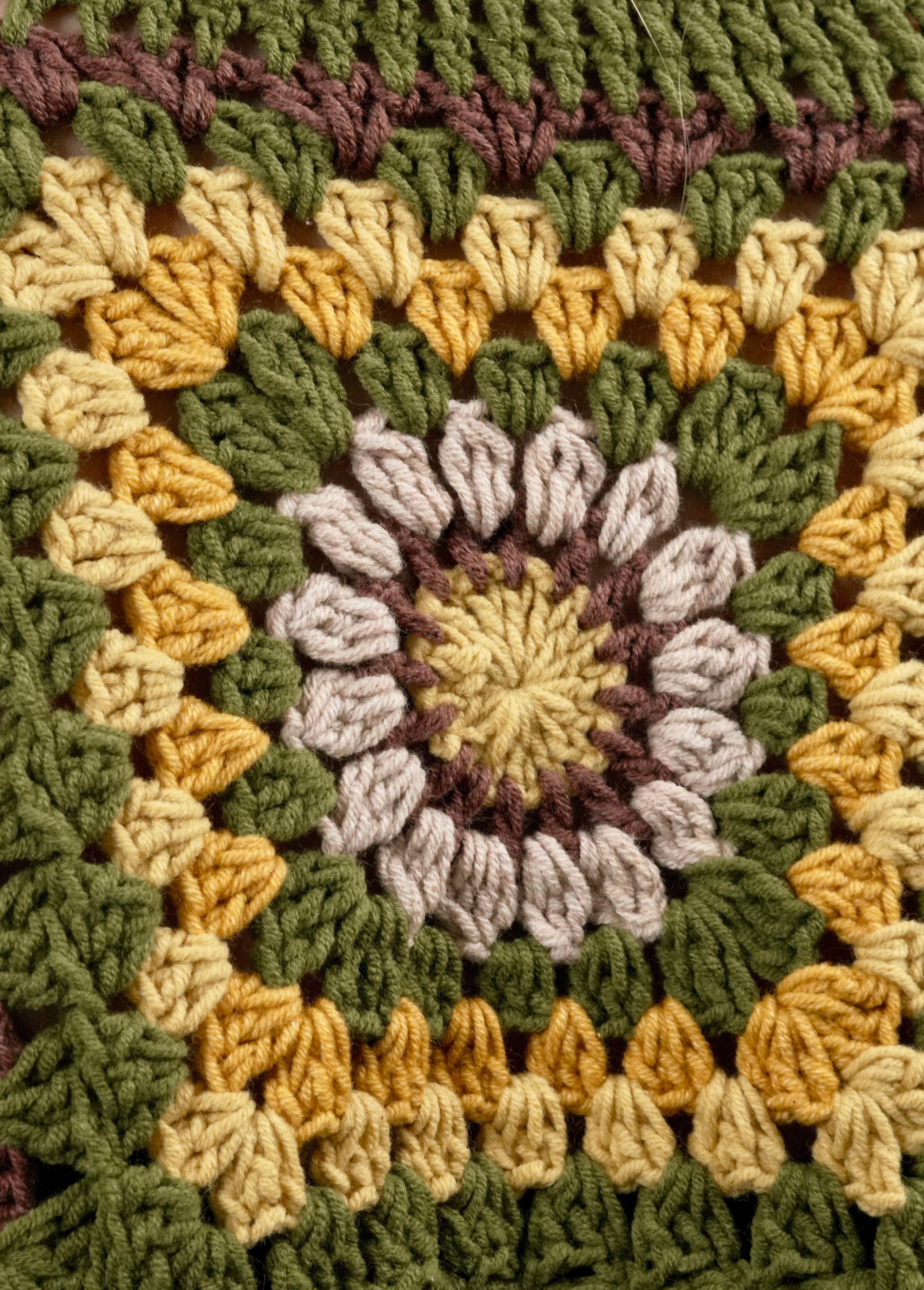 • 🎨 Hand-crocheted granny squares in artisan color palettes
