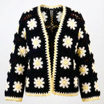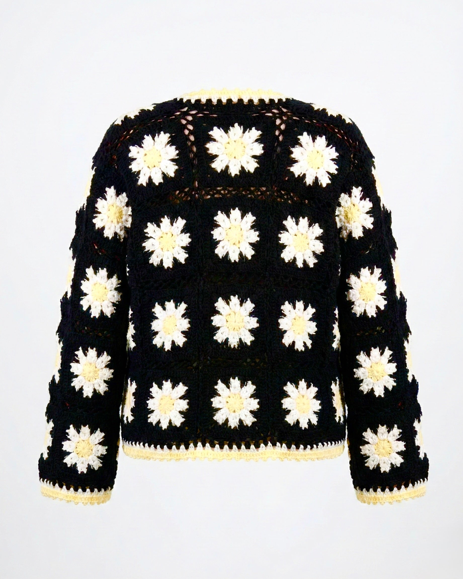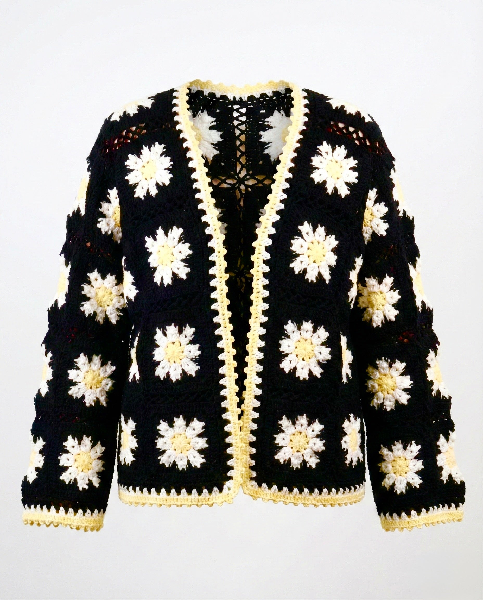 The Midnight Daisy Crochet Cardigan is a striking blend of classic and contemporary — handmade from 100% organic cotton and detailed with soft white and cream daisy motifs against a deep black base. Lightweight yet full of texture, it’s a statement piece that adds elegance and artistry to any outfit.