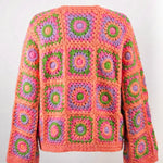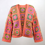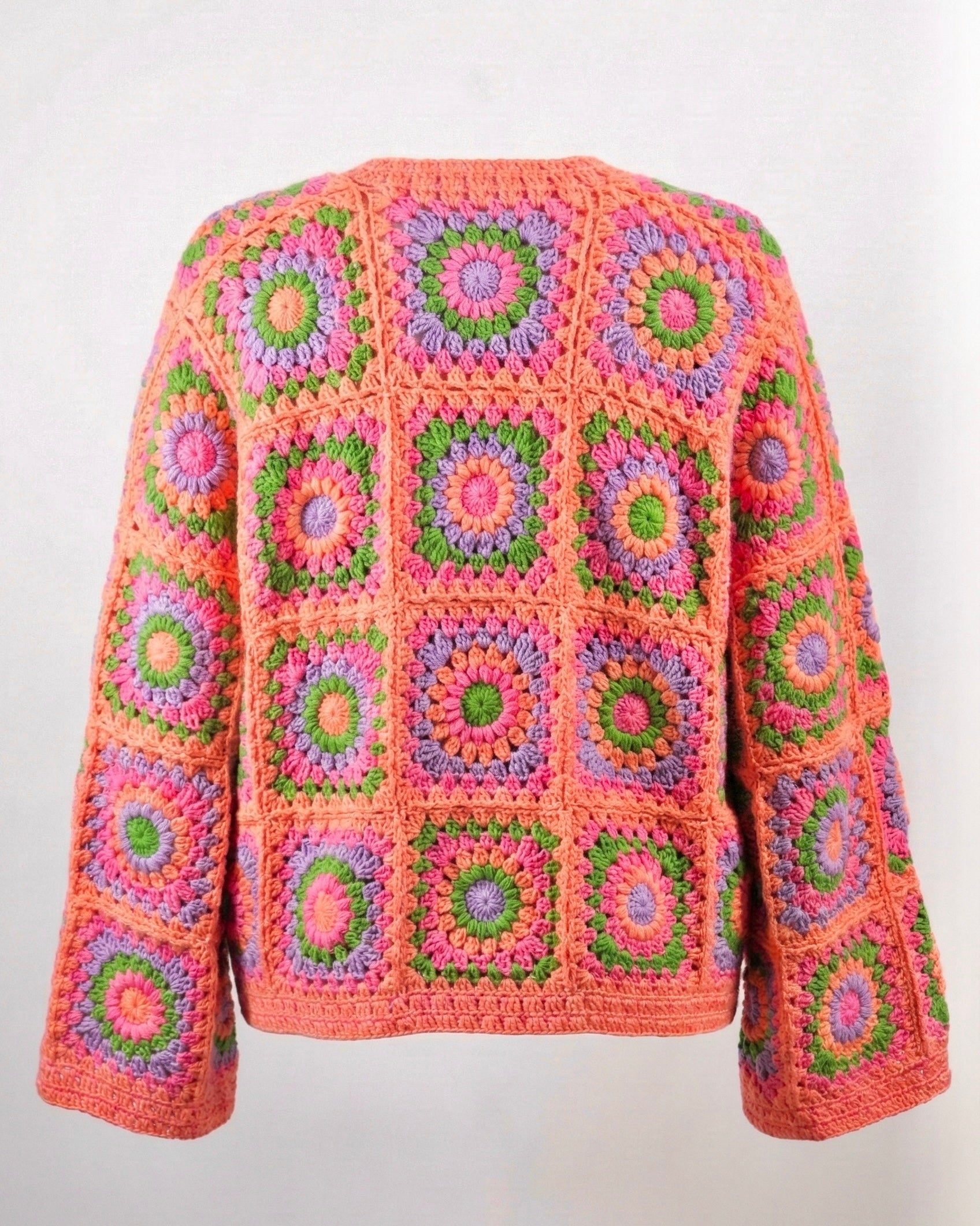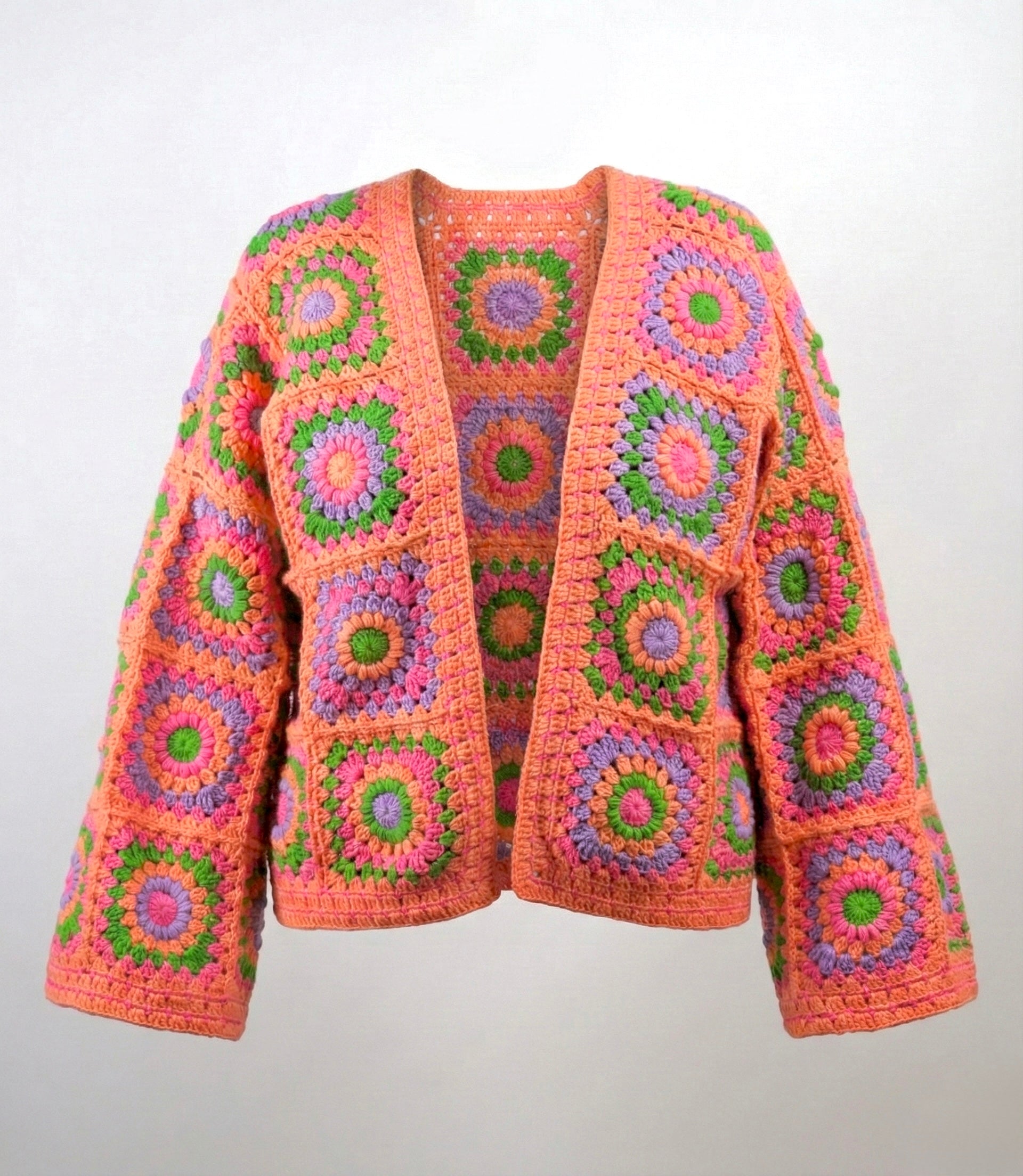 The Sunset Bloom Crochet Cardigan captures the warmth of summer in every stitch. Handcrafted from 100% organic cotton, it features vibrant circular motifs in lilac, green, and orange tones — beautifully crocheted on a warm peach-orange base.