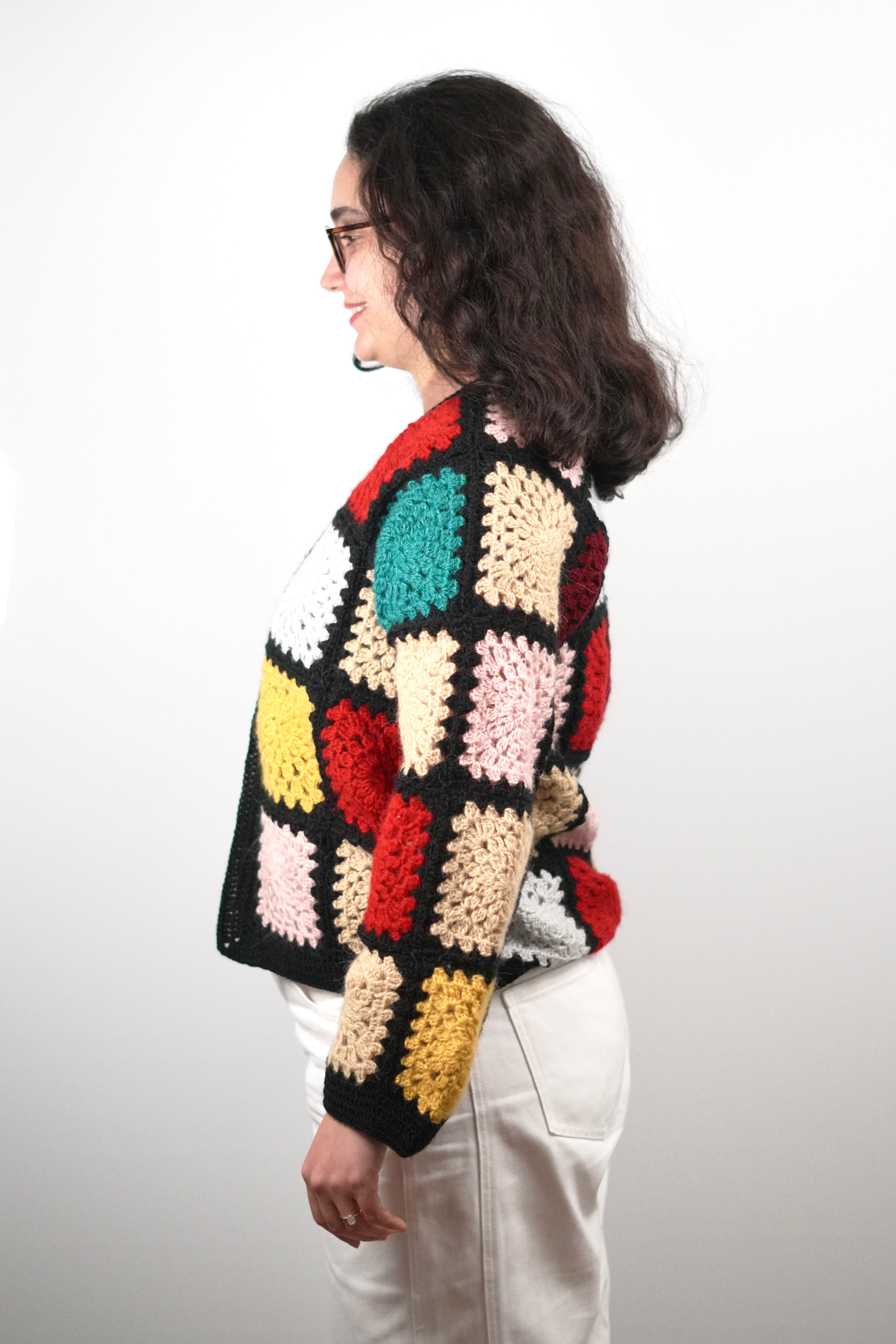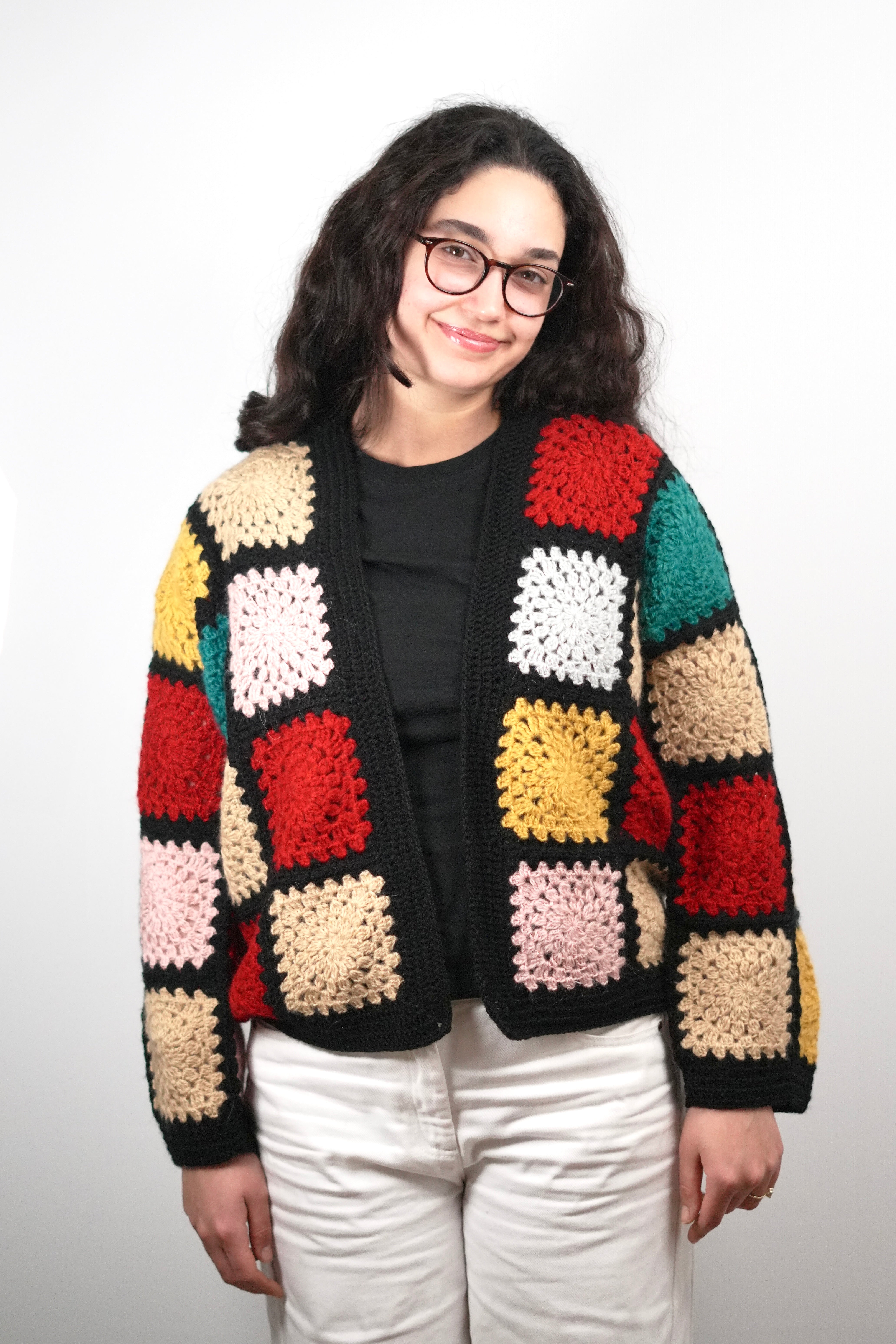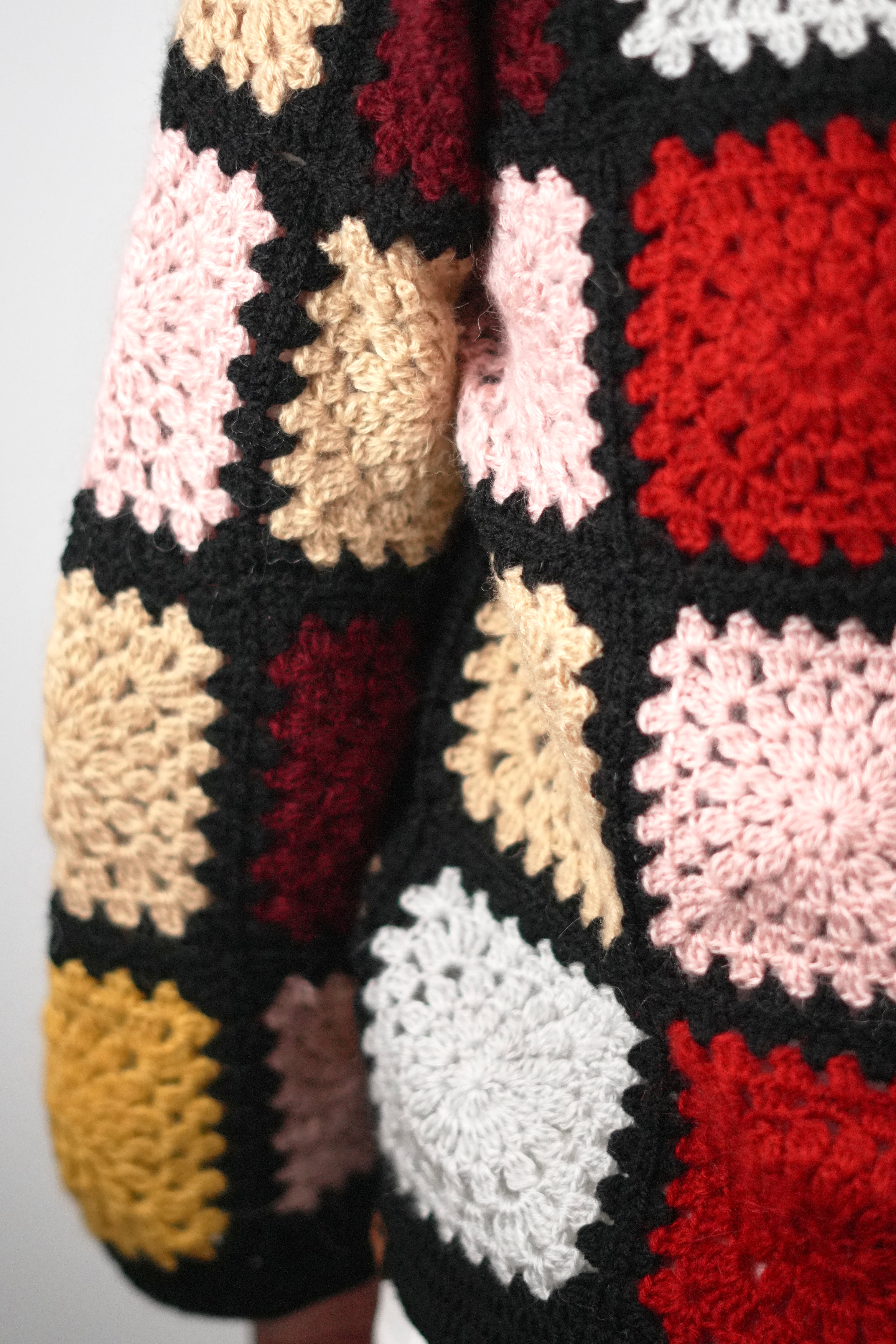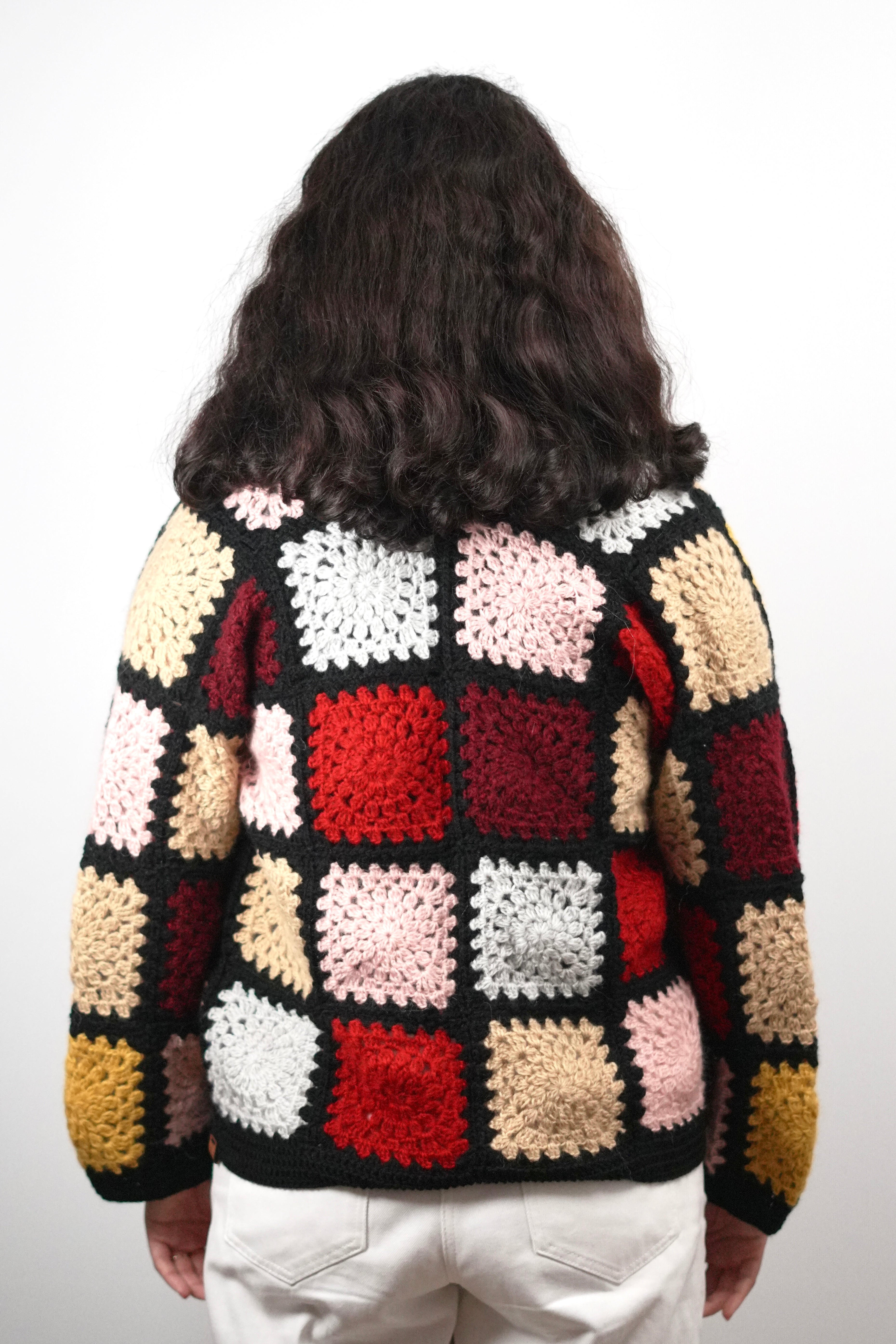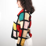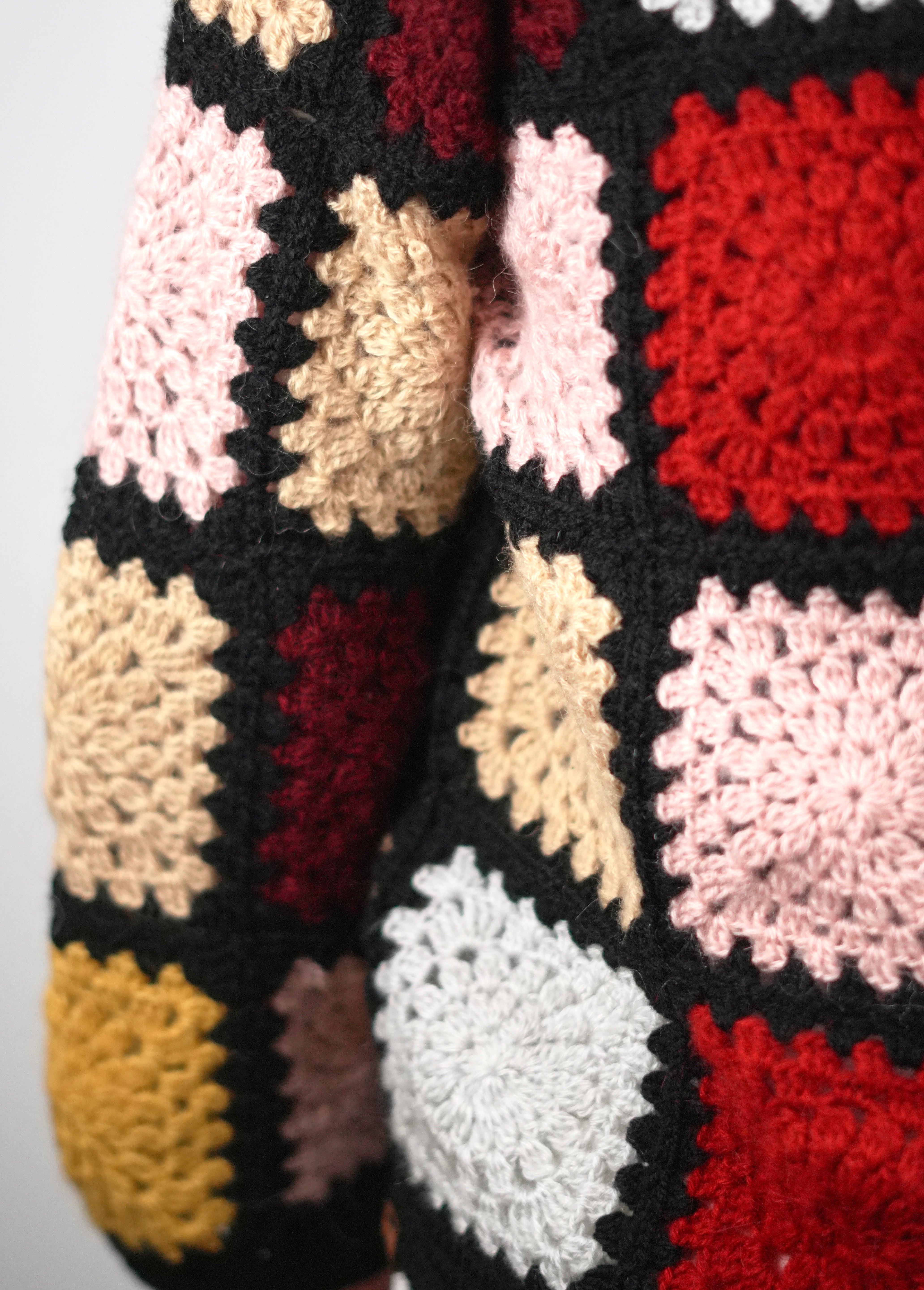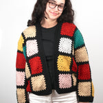 Bring vintage artistry to modern days with our Retro Patch Crochet Cardigan. Handcrafted from soft wool blend yarn, this colorful design features classic granny squares in warm, bold shades framed by deep black edges — a true nod to timeless crochet heritage.