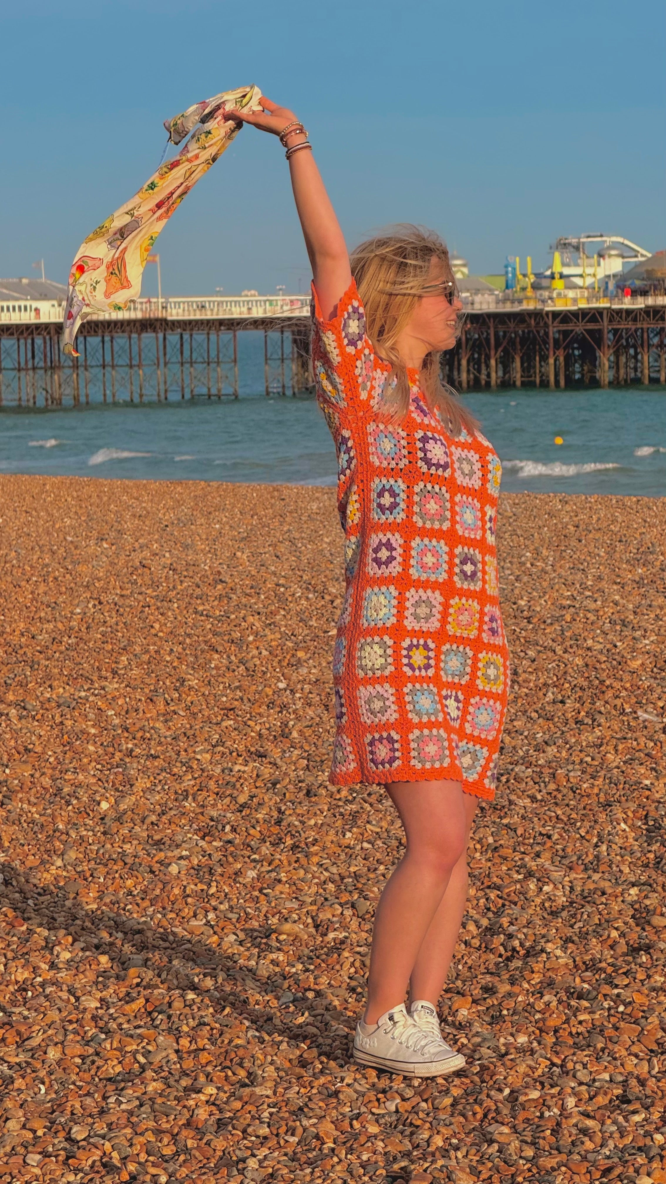 Handmade crochet dress crafted from soft organic cotton in bright sunset orange with colourful granny squares.