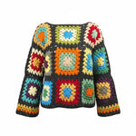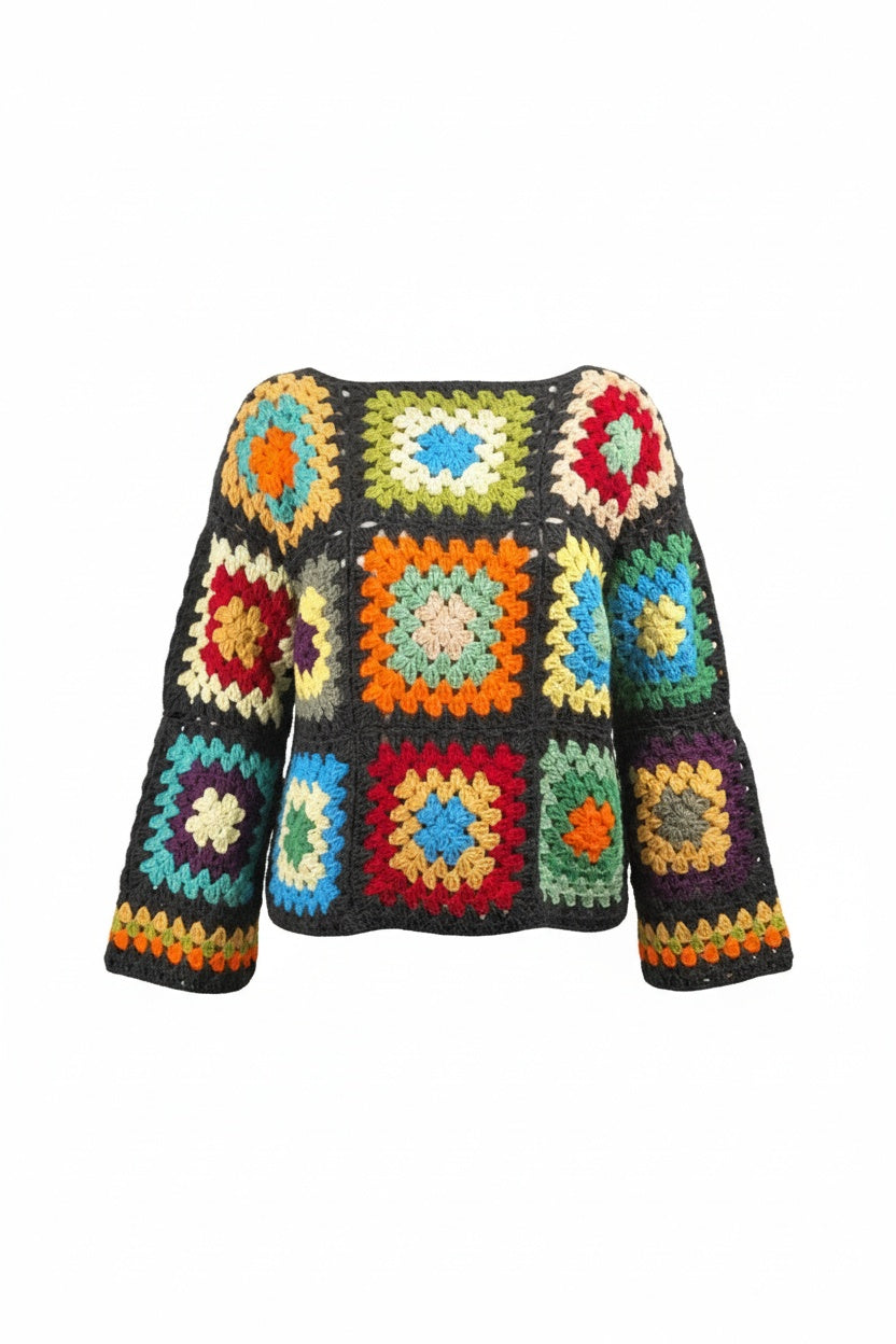Bring retro vibes to life with the Retroa Crochet Sweater – a bold patchwork of vibrant granny squares set against a deep, dramatic base. Handmade from 100% organic cotton, this sweater blends timeless craft with a modern edge, making it a true statement piece.
