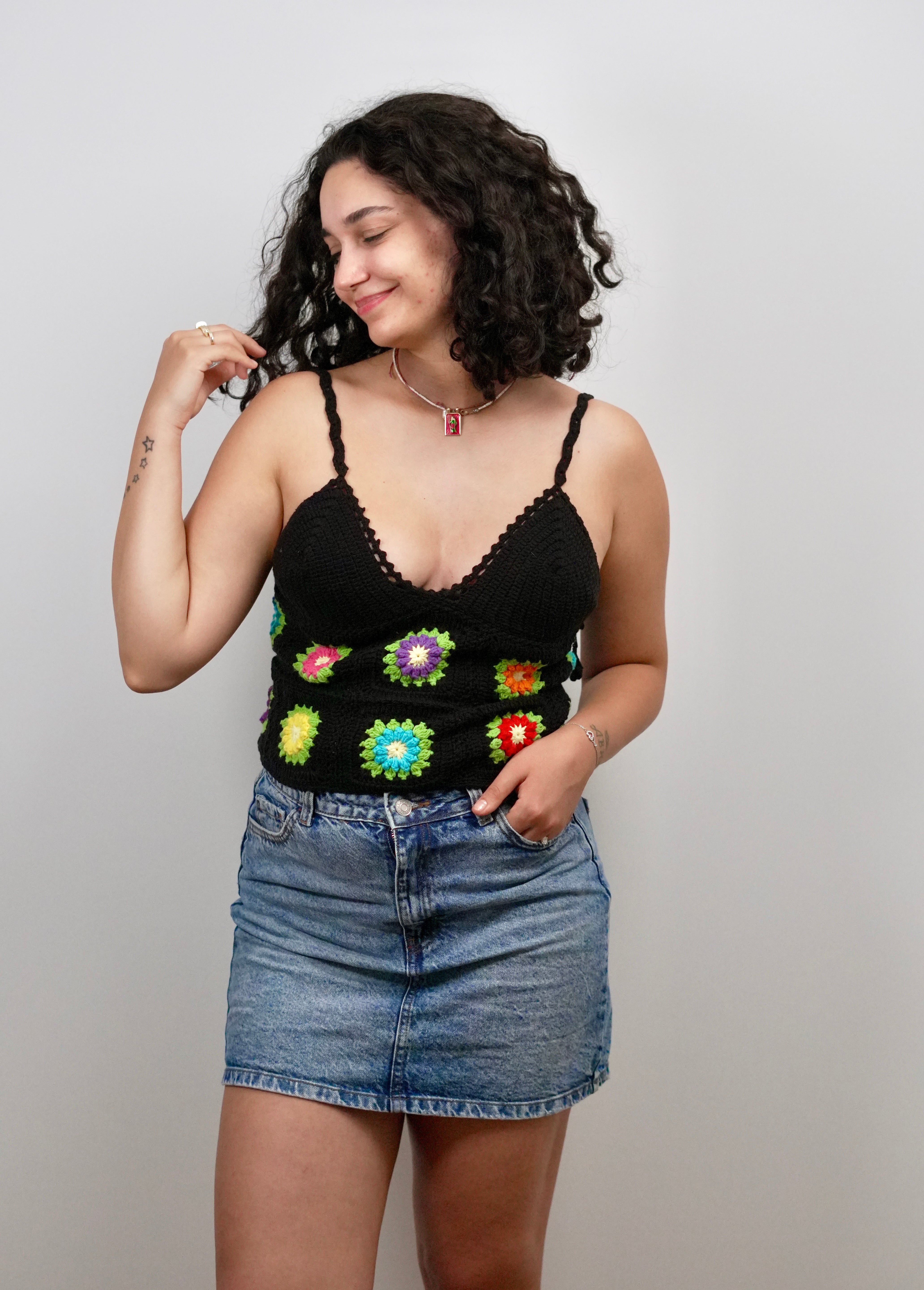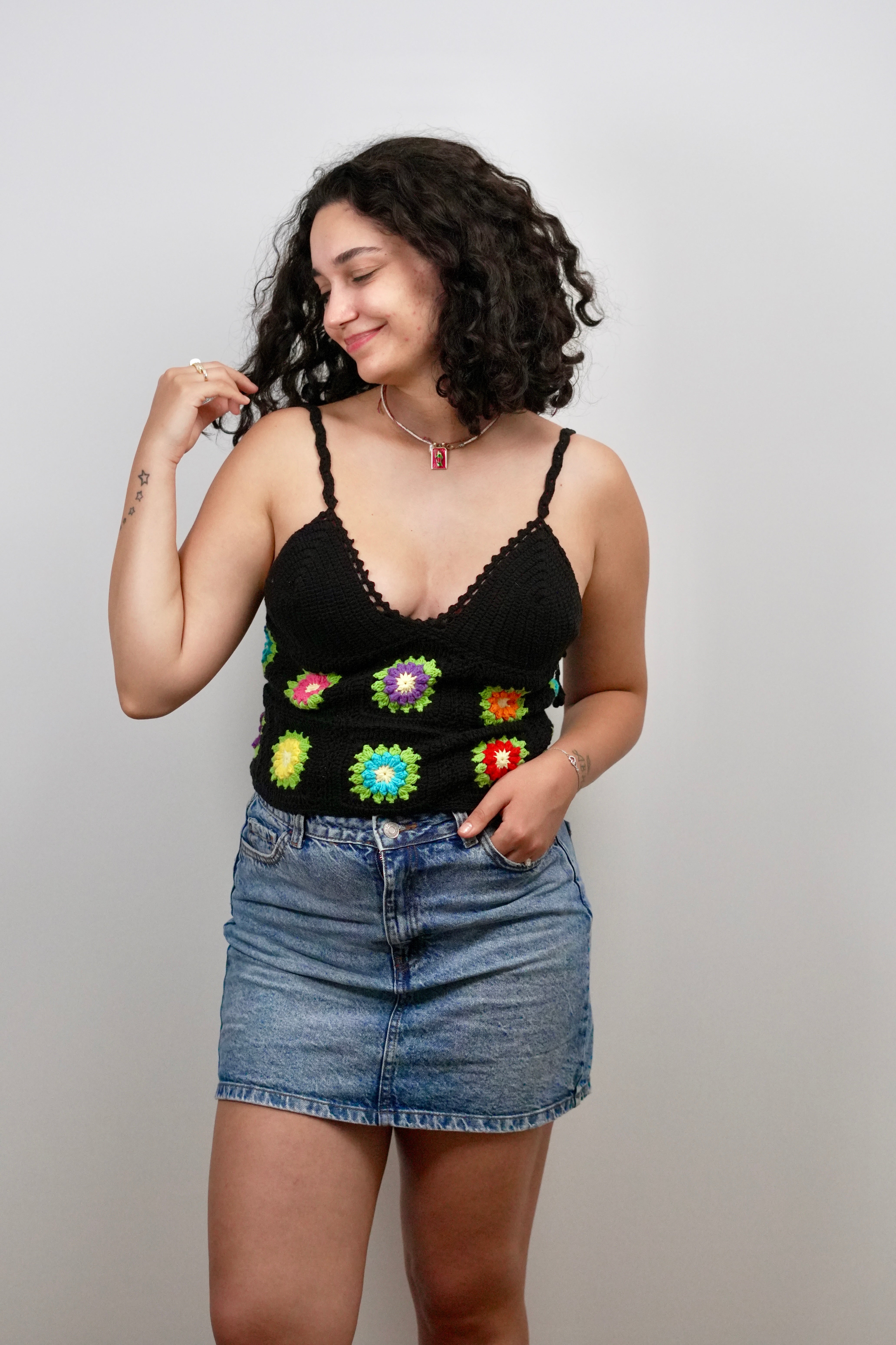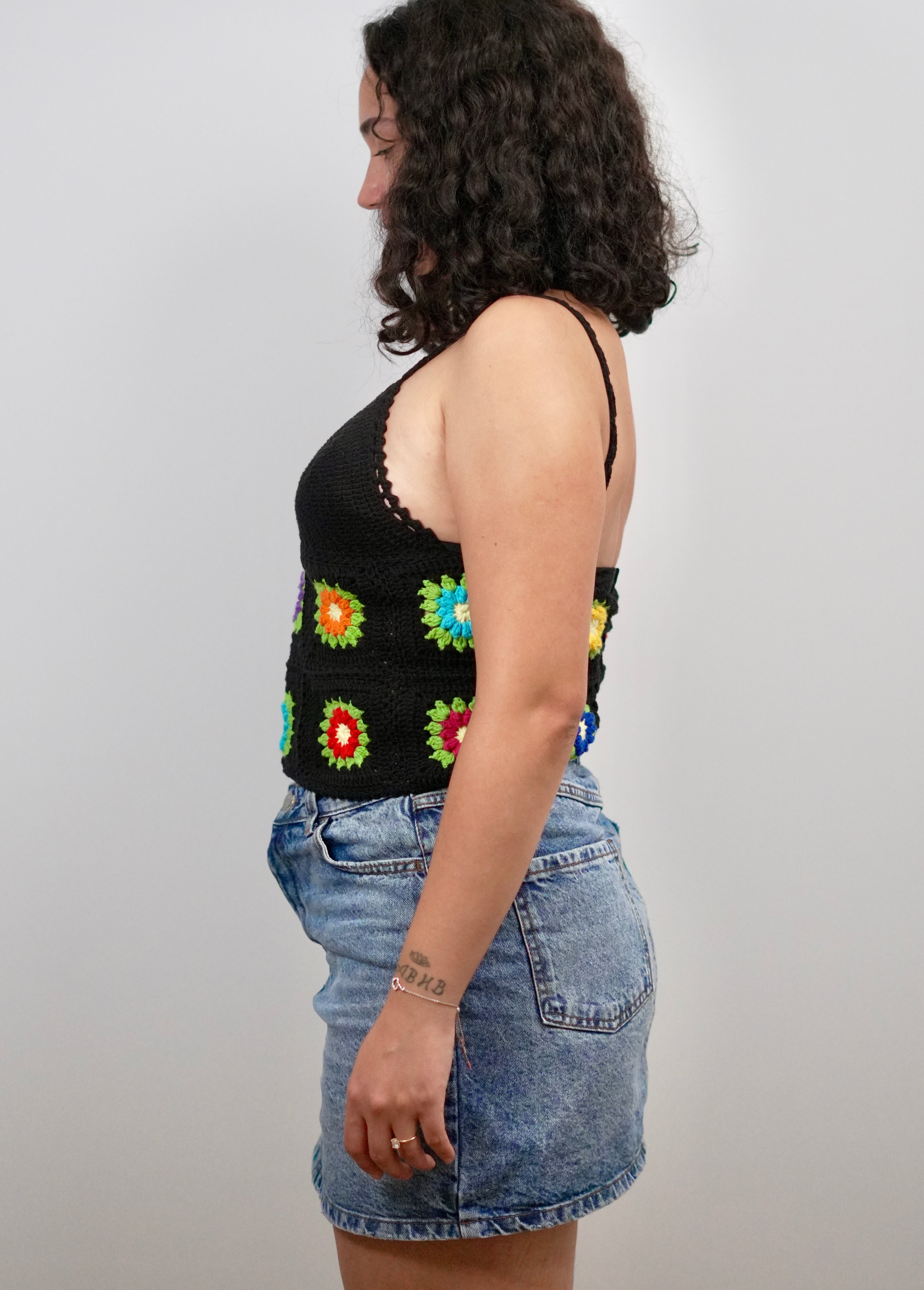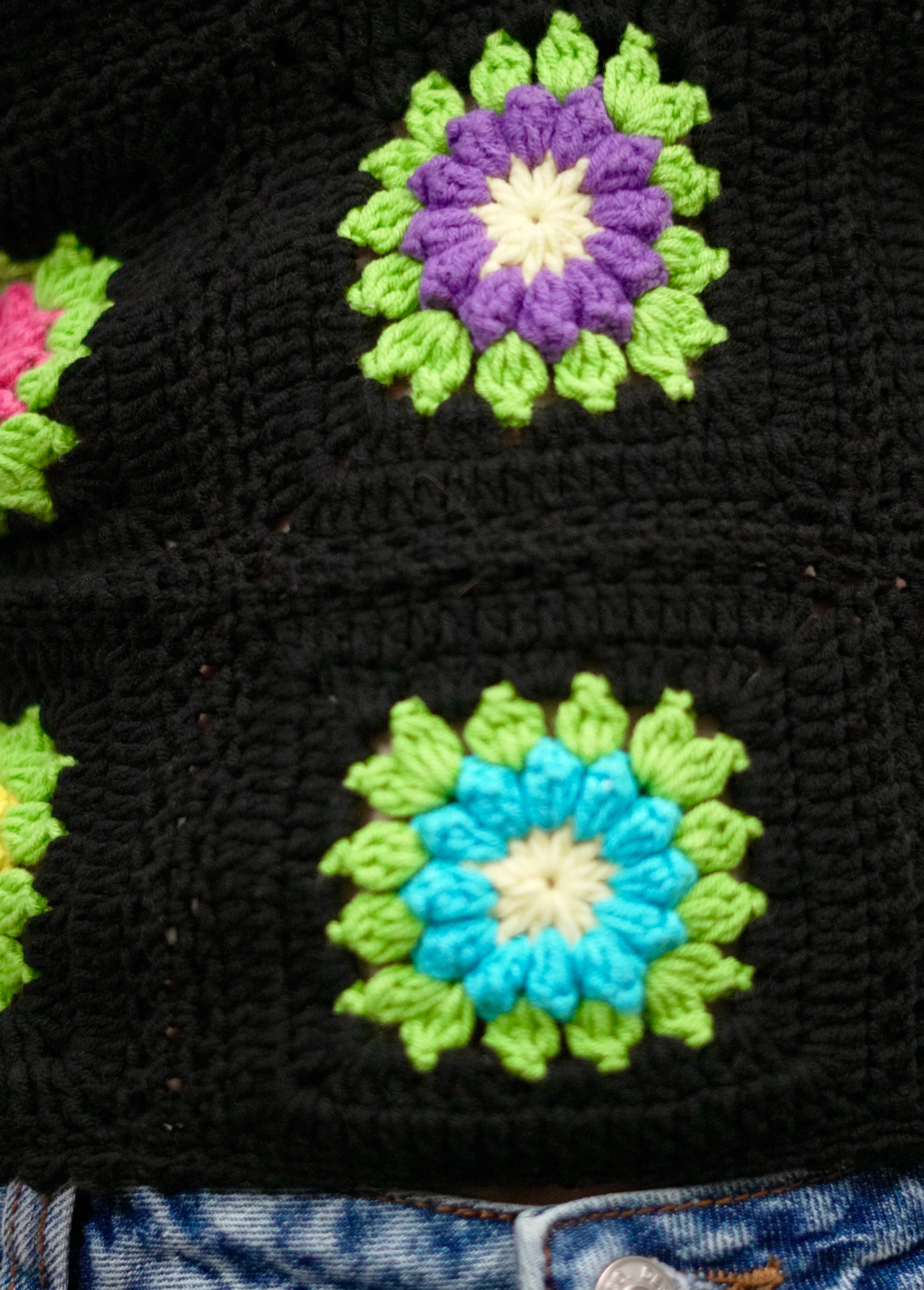 Dark elegance with a burst of colour. The Midnight Garden Top features a black base adorned with vibrant floral granny squares, creating a striking contrast that feels bold and timeless. Perfect for festivals, summer nights, or layering with your everyday style.