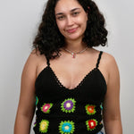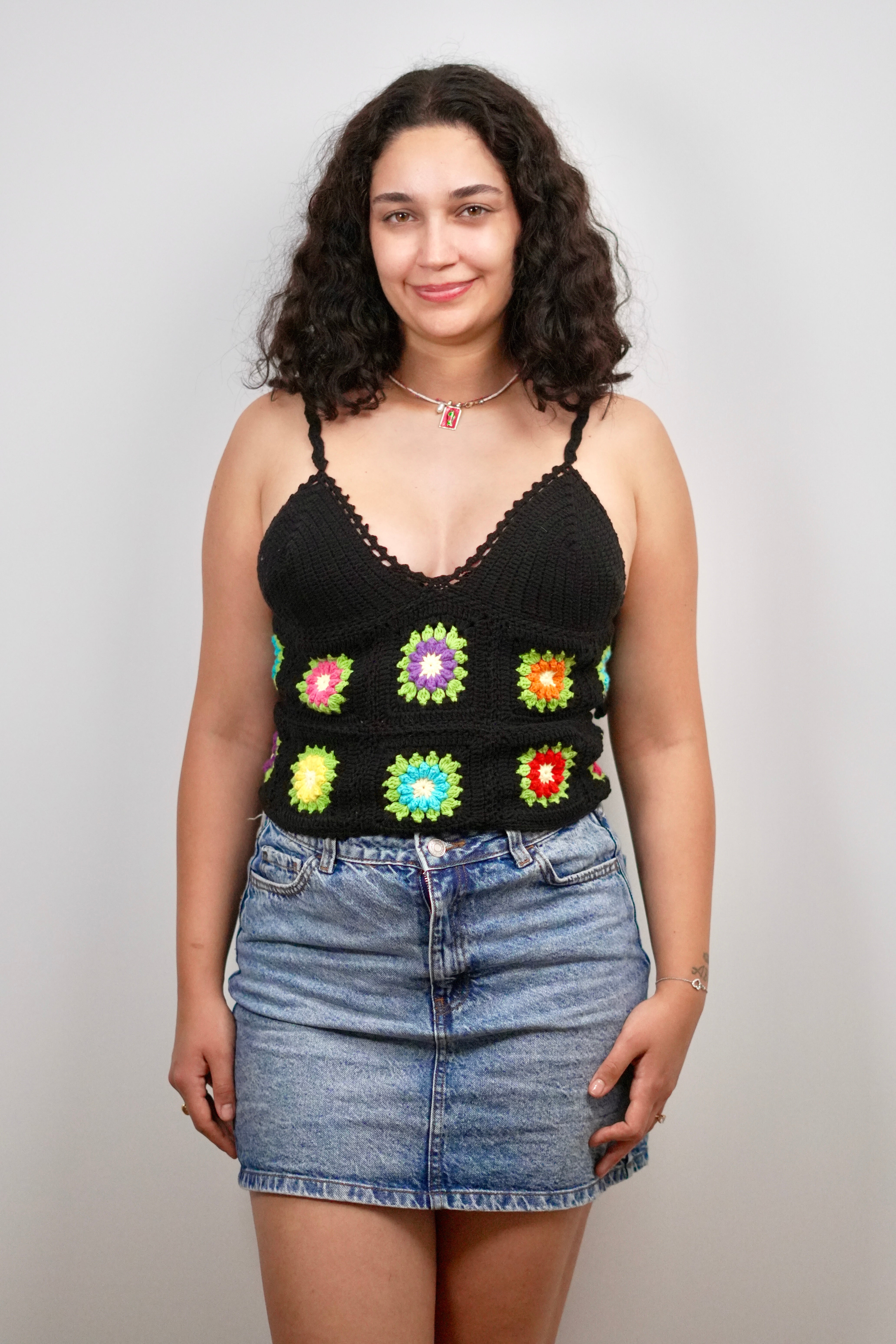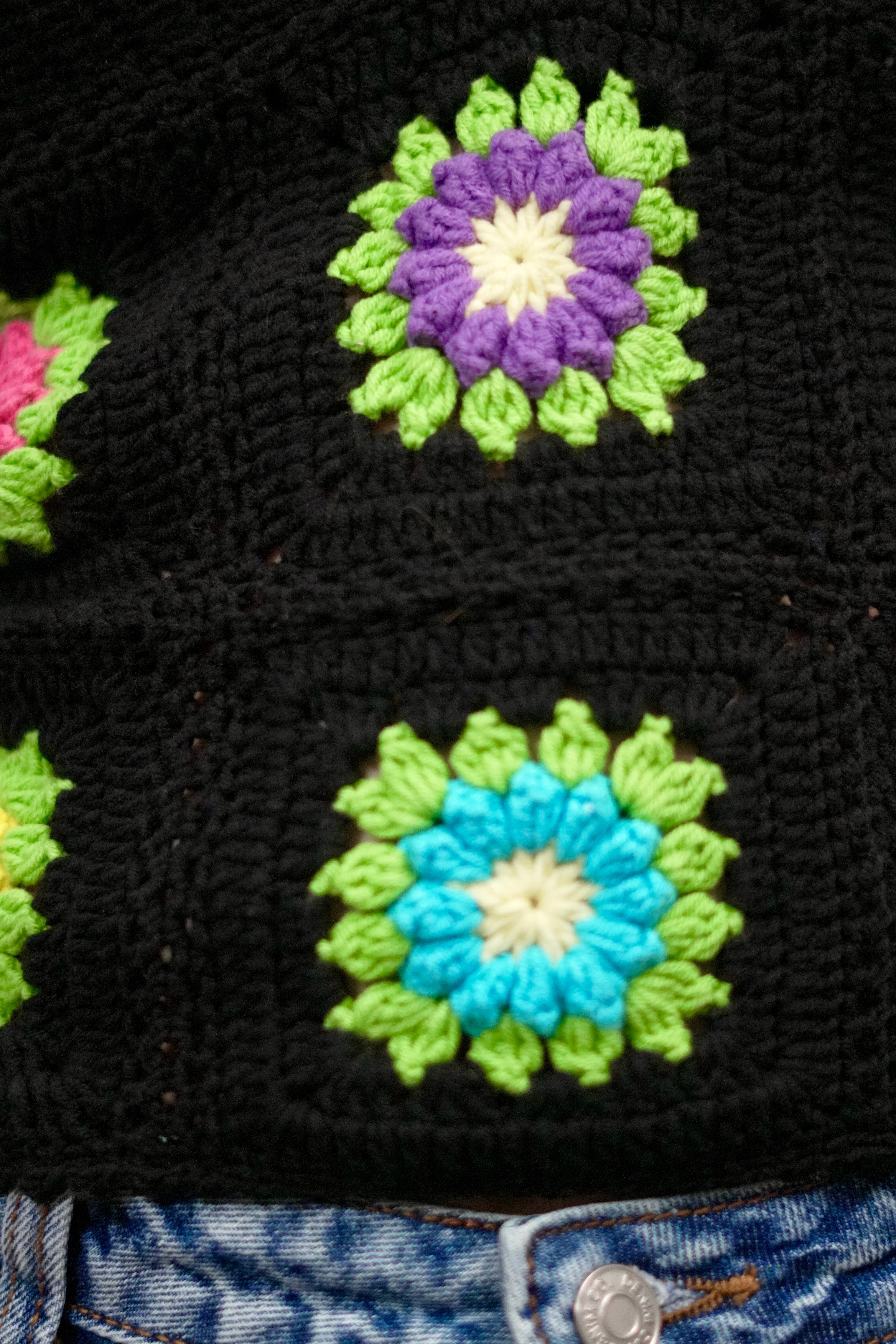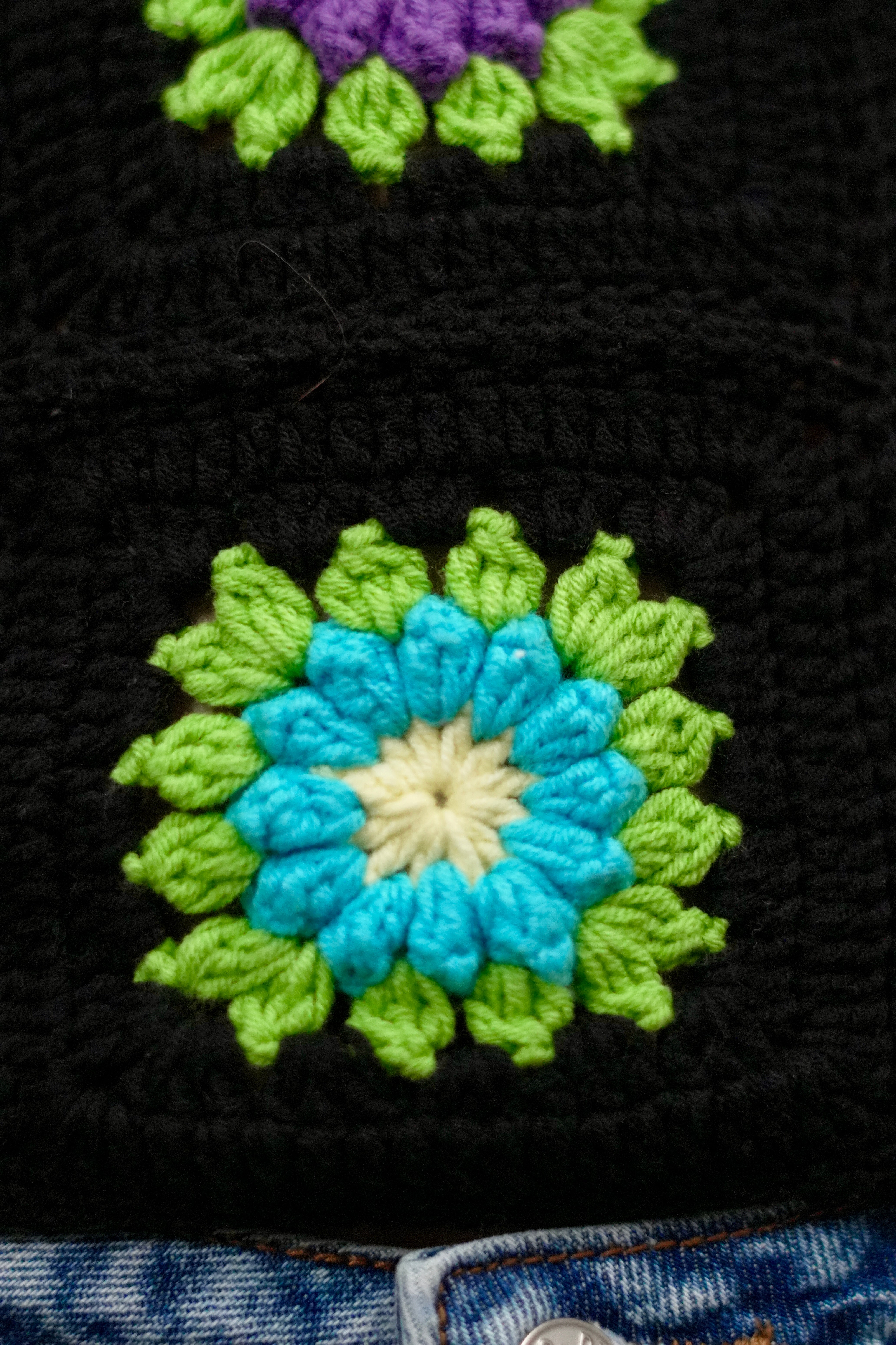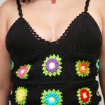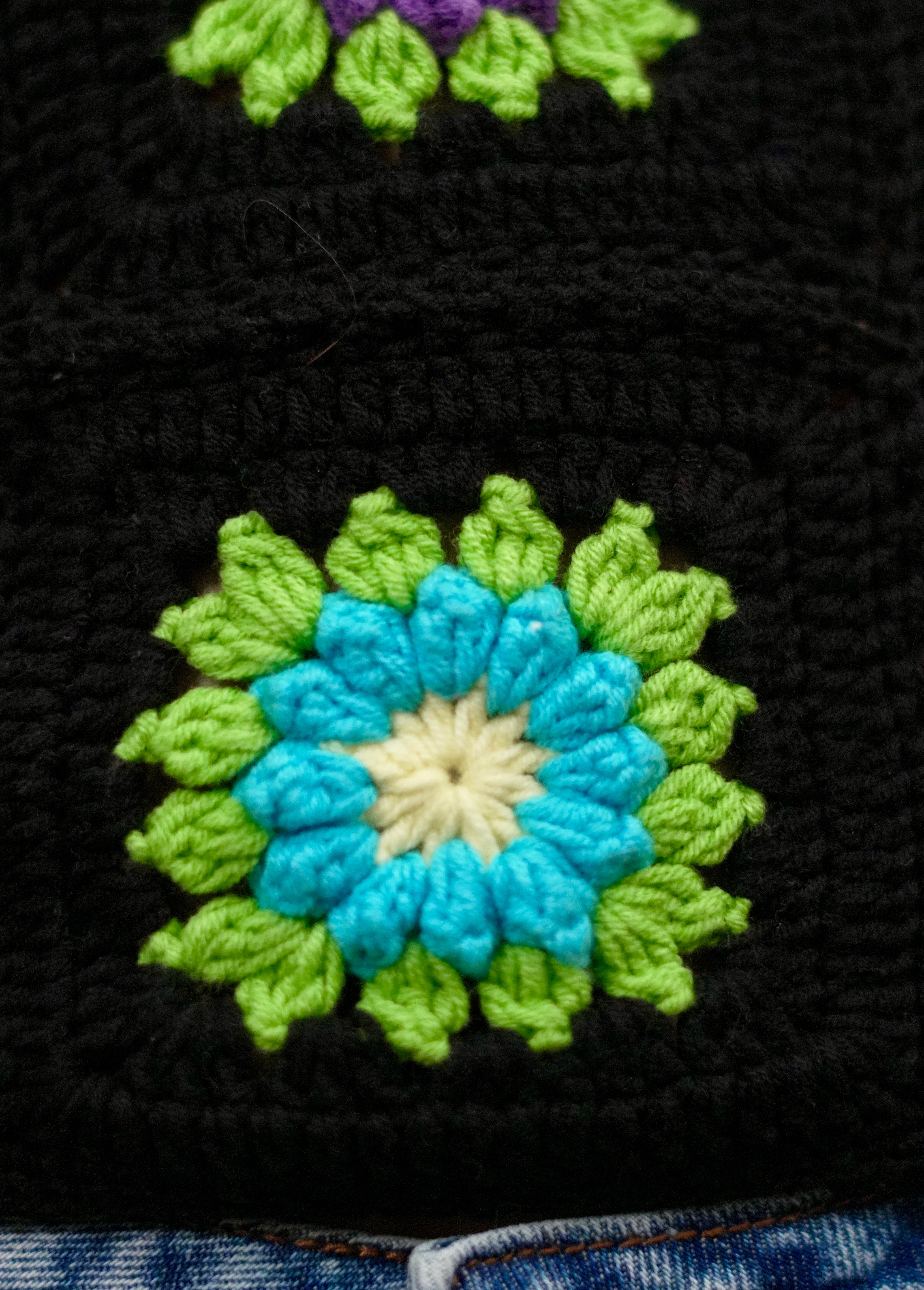 Dark elegance with a burst of colour. The Midnight Garden Top features a black base adorned with vibrant floral granny squares, creating a striking contrast that feels bold and timeless. Perfect for festivals, summer nights, or layering with your everyday style.