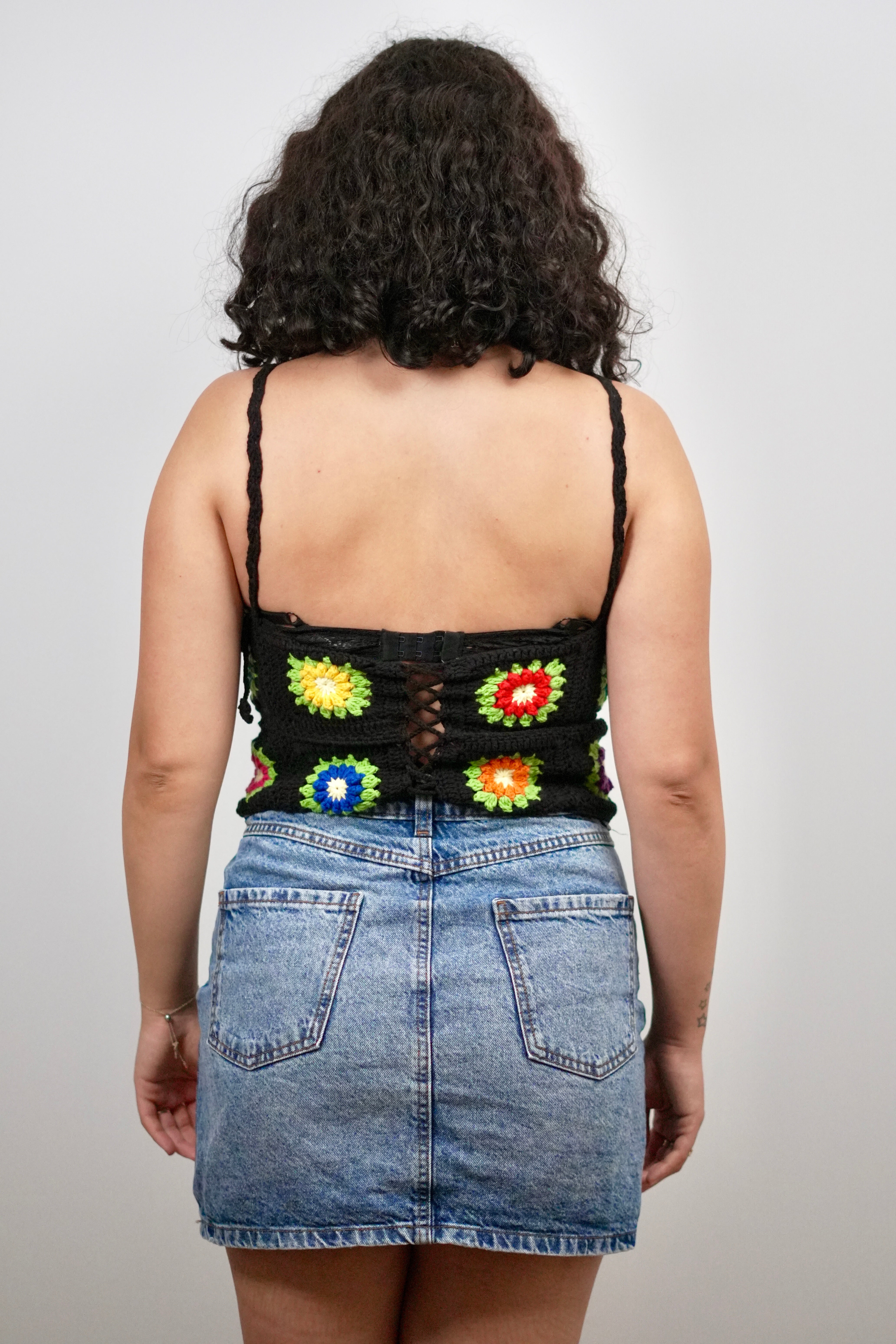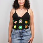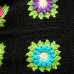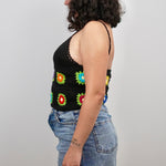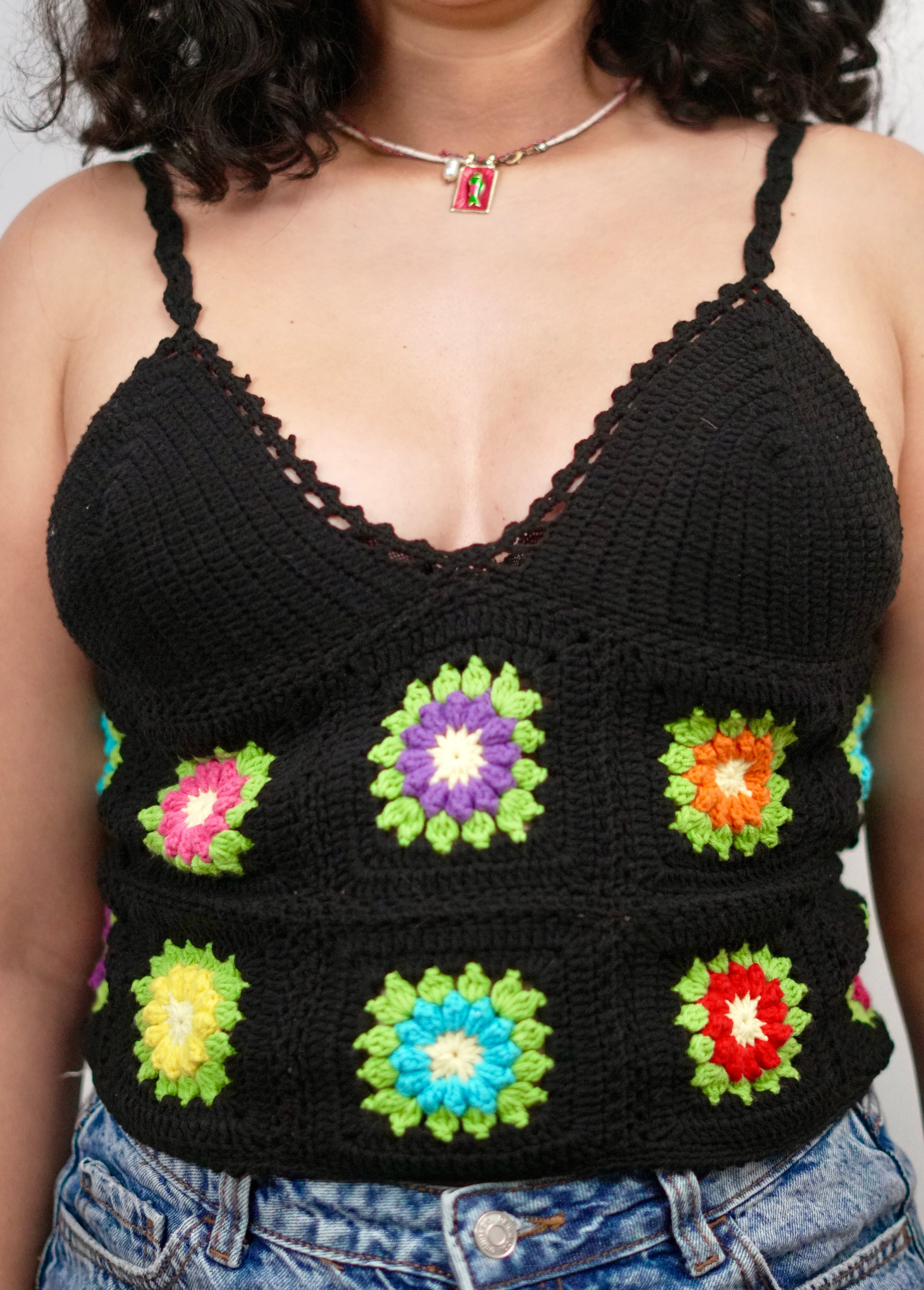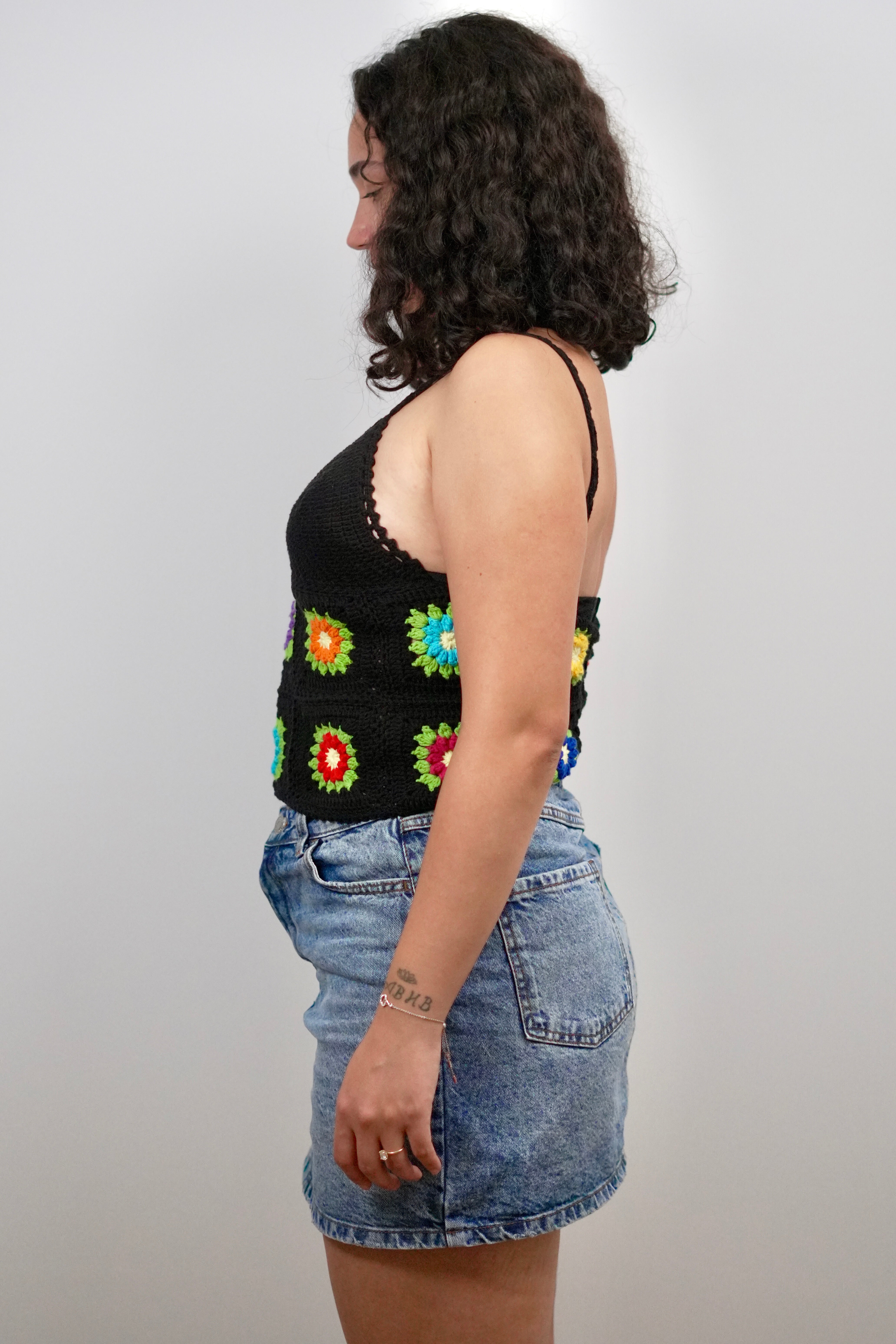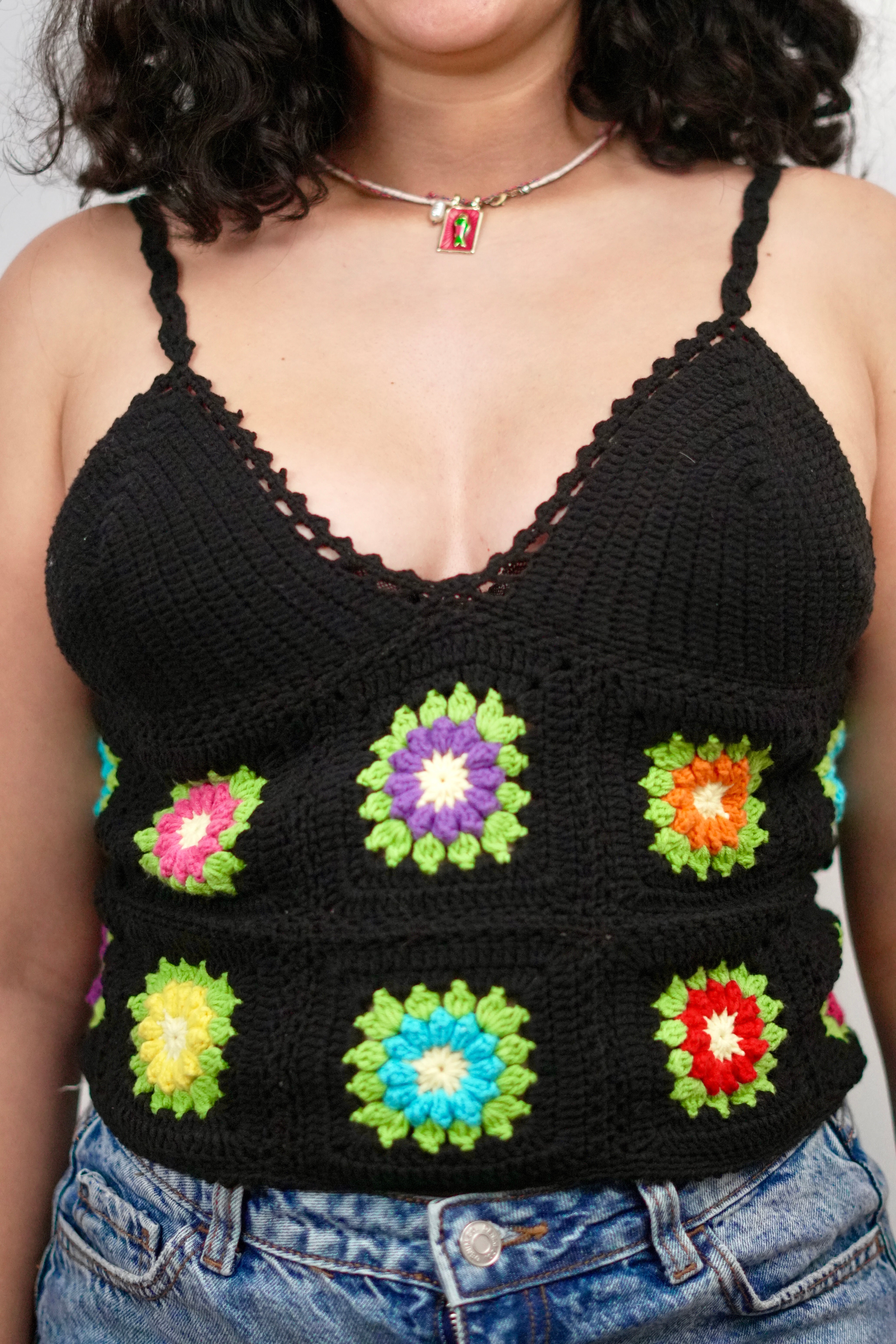 Dark elegance with a burst of colour. The Midnight Garden Top features a black base adorned with vibrant floral granny squares, creating a striking contrast that feels bold and timeless. Perfect for festivals, summer nights, or layering with your everyday style.