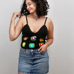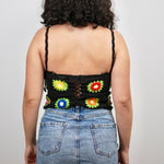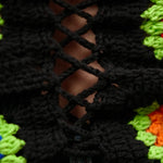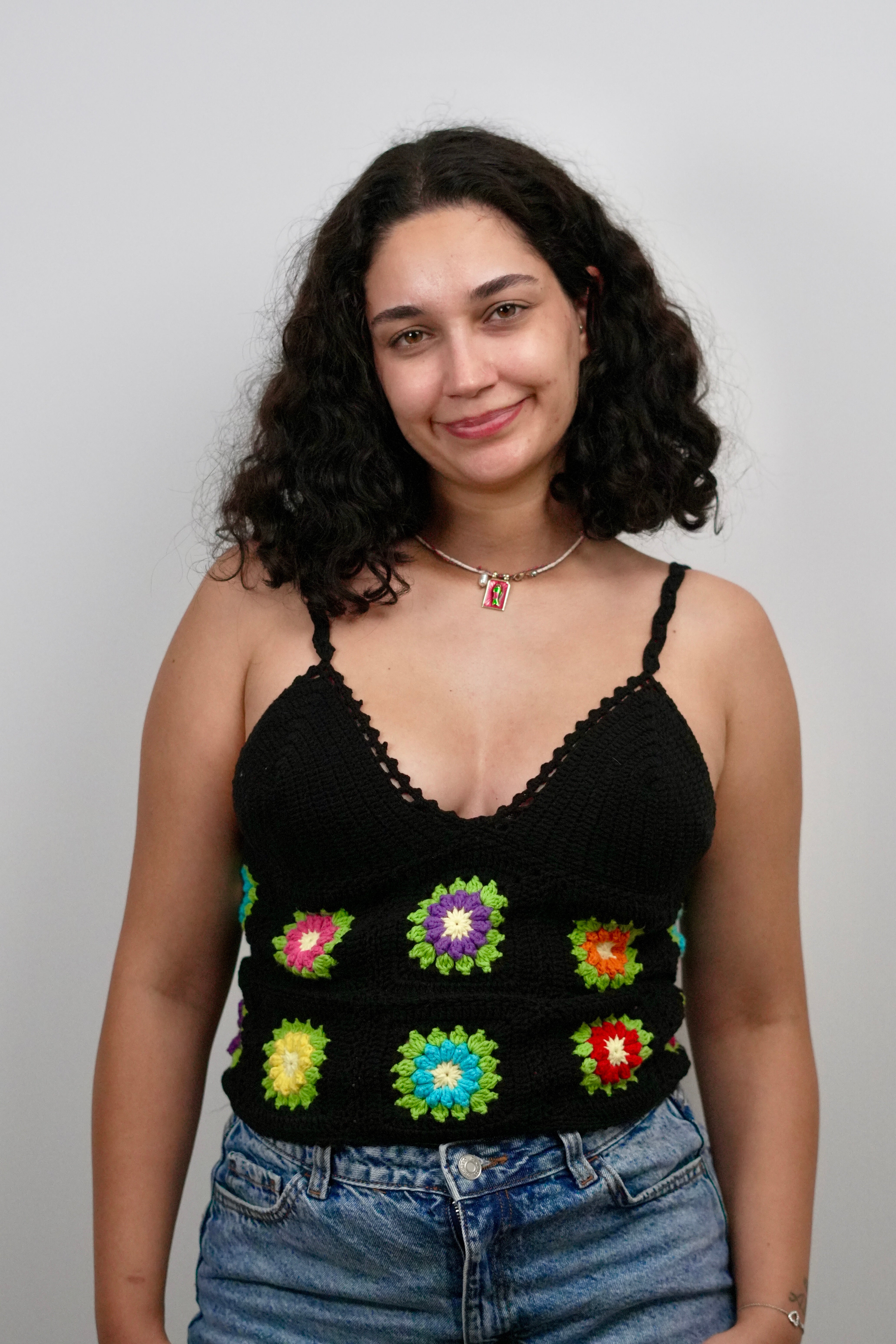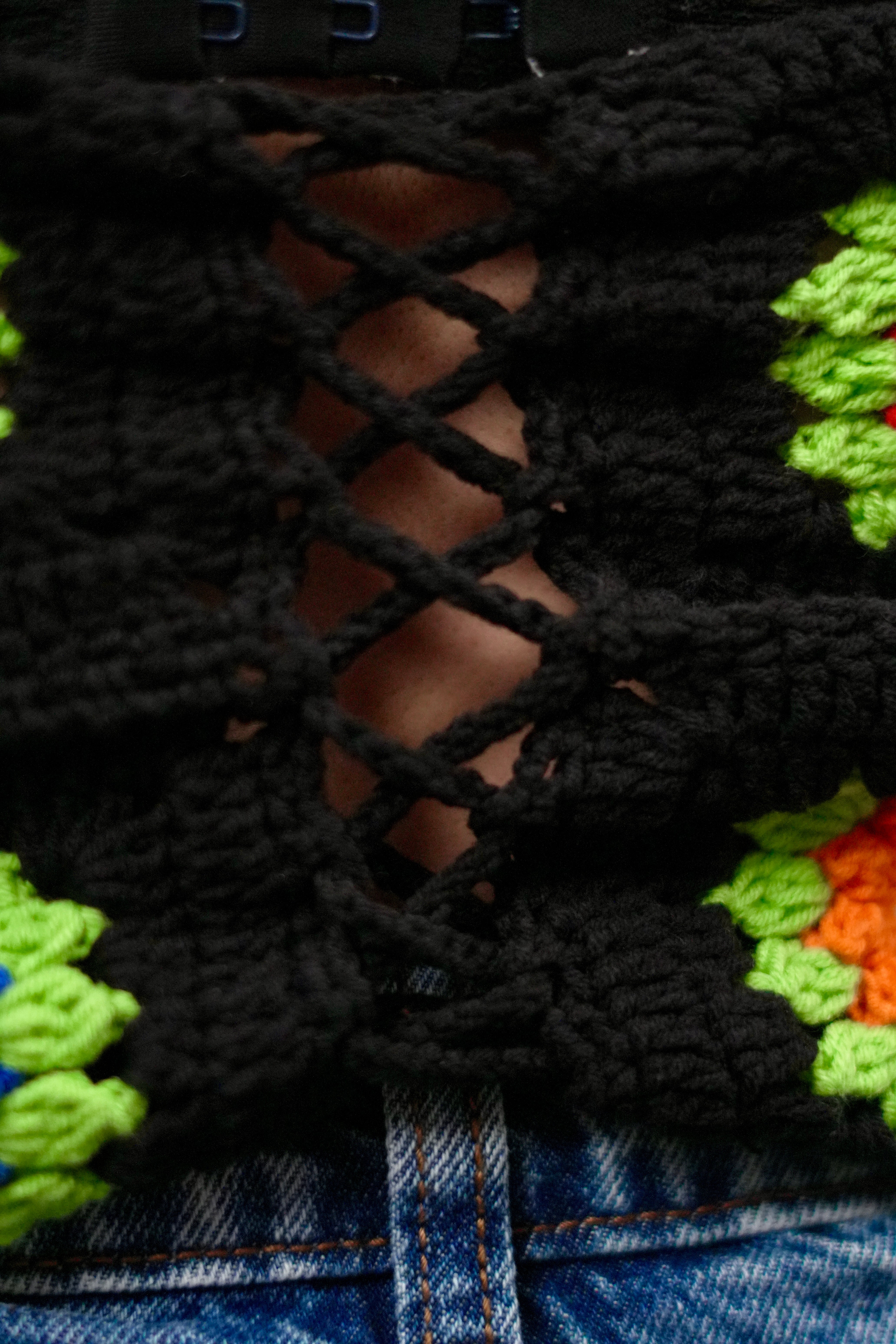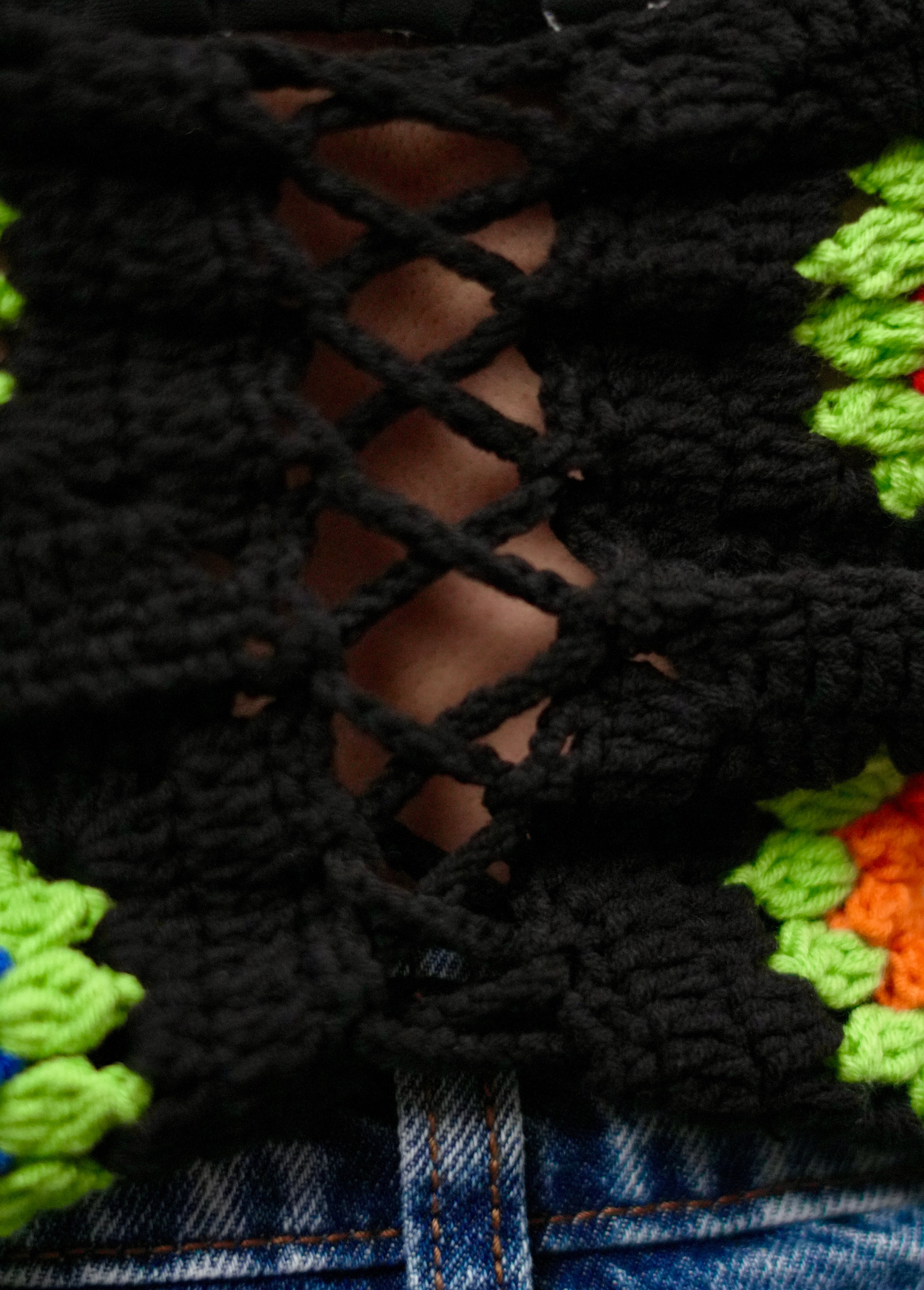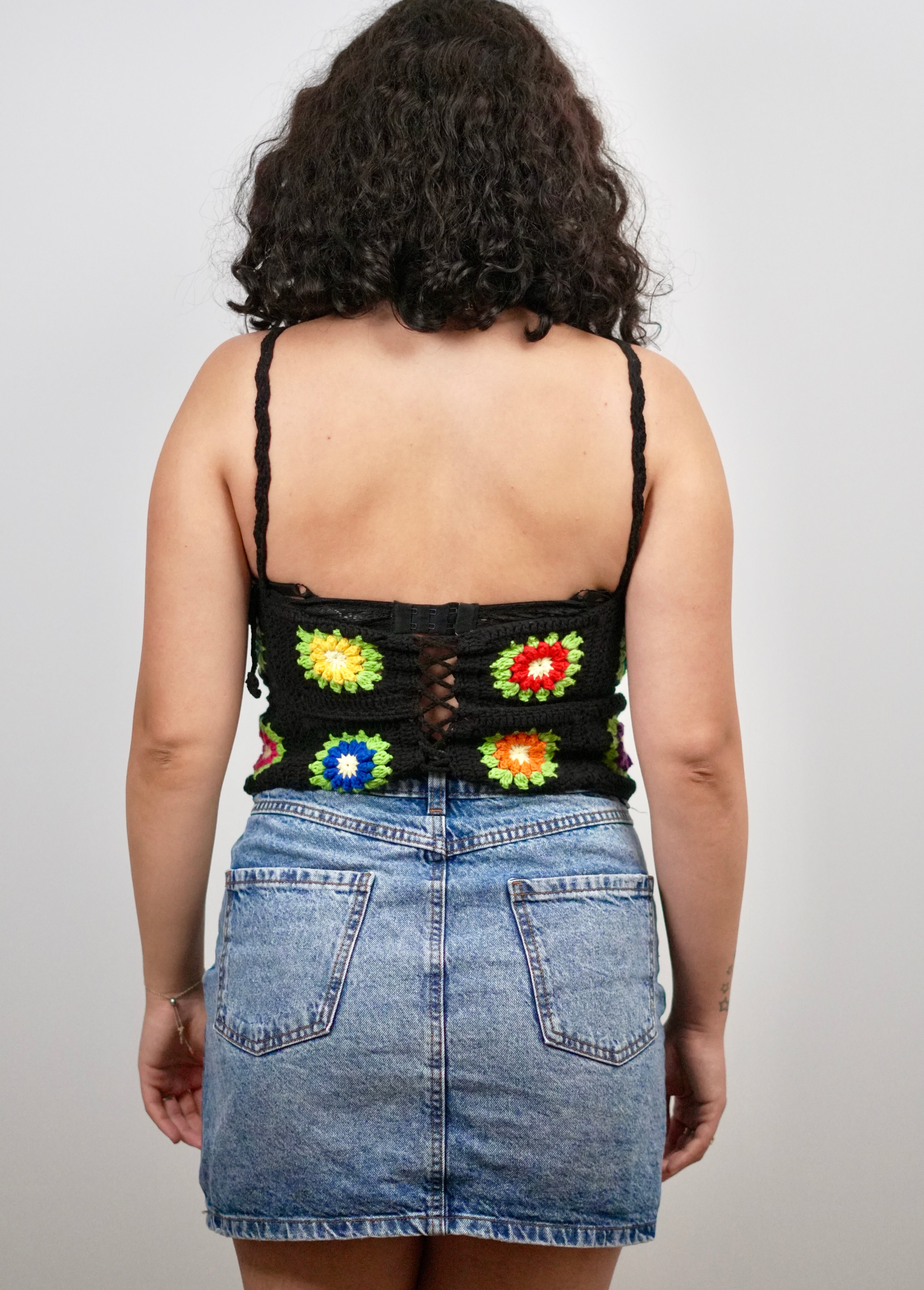Dark elegance with a burst of colour. The Midnight Garden Top features a black base adorned with vibrant floral granny squares, creating a striking contrast that feels bold and timeless. Perfect for festivals, summer nights, or layering with your everyday style.
