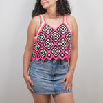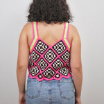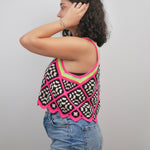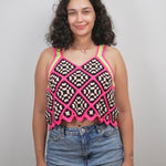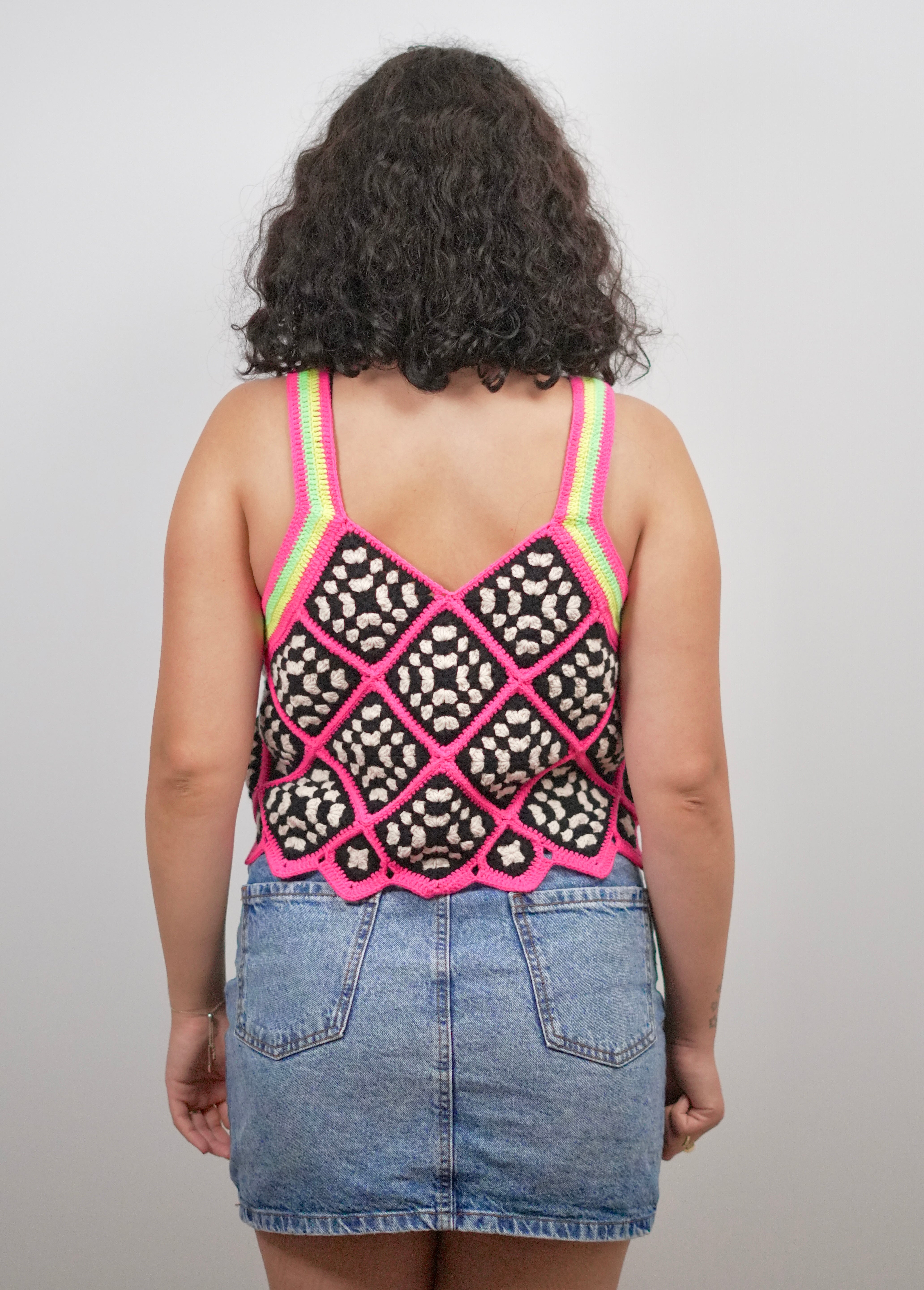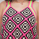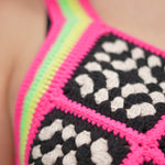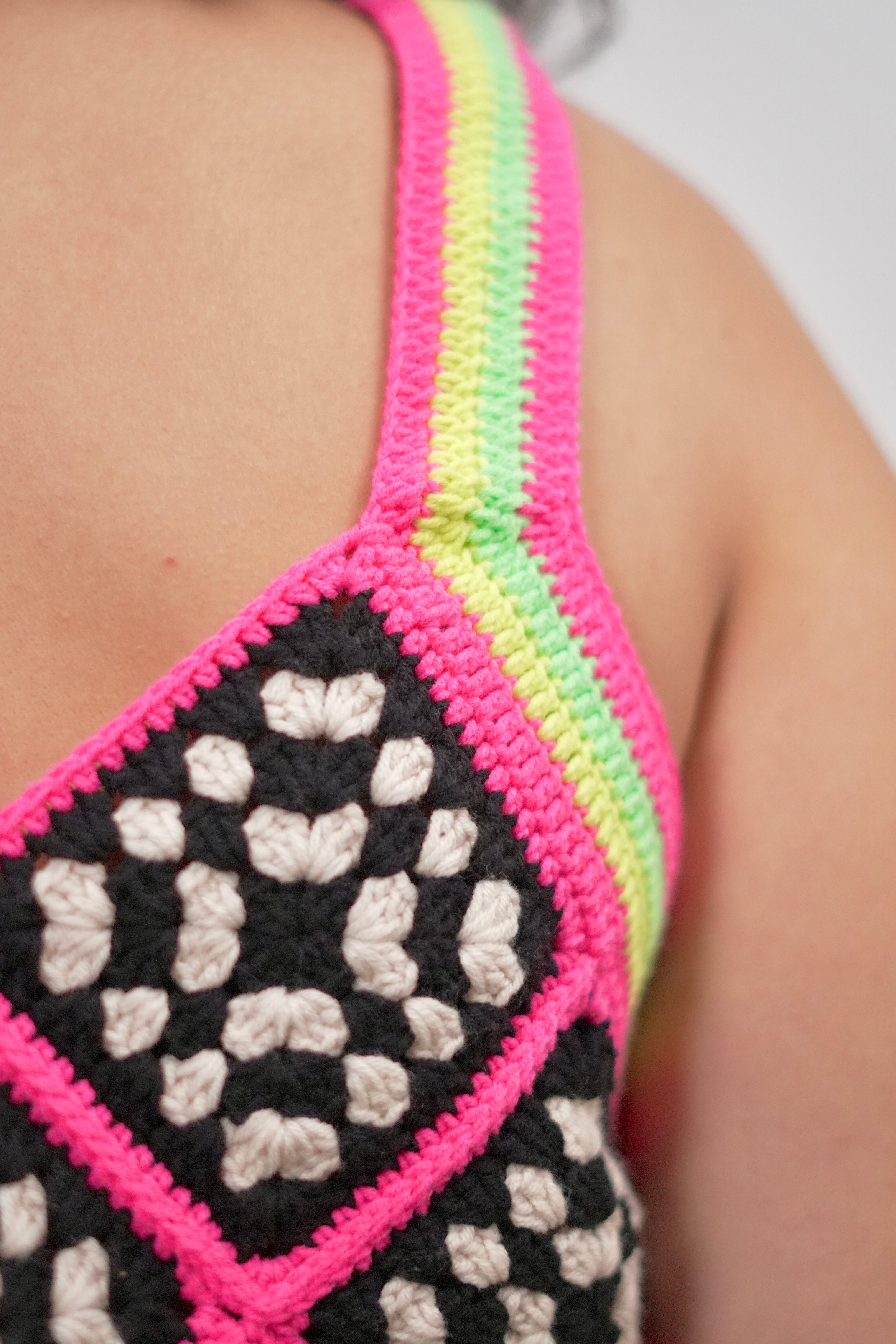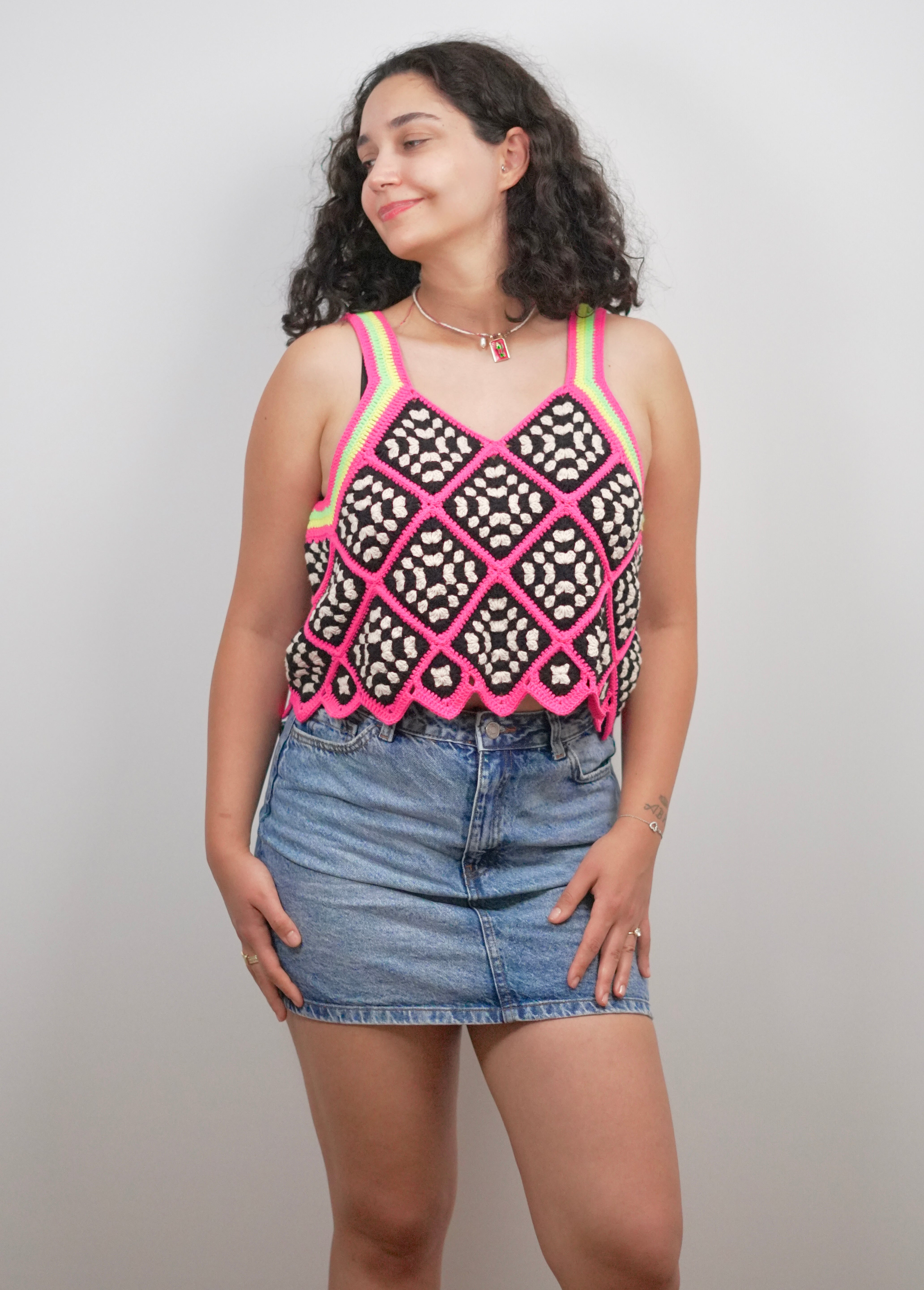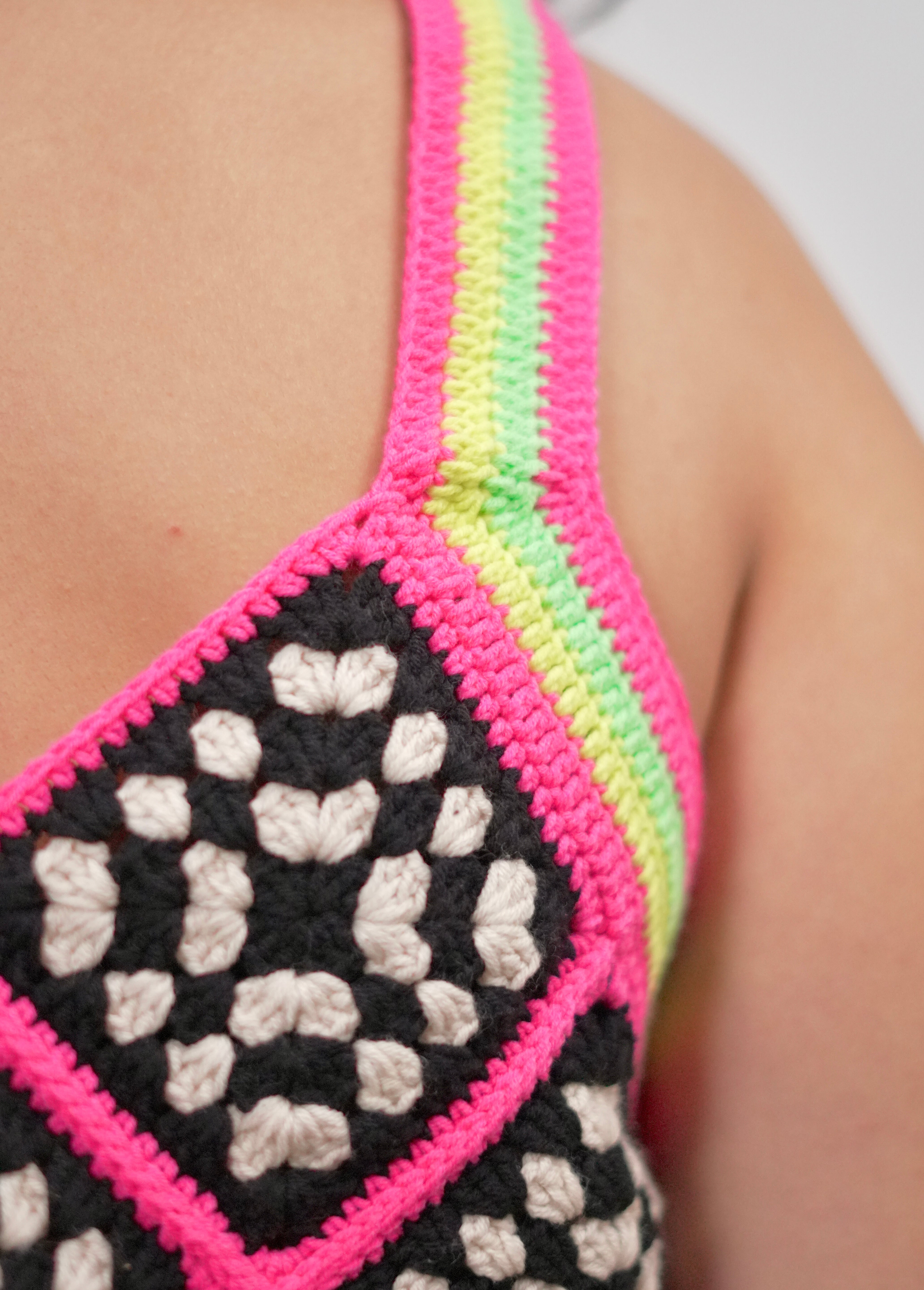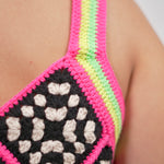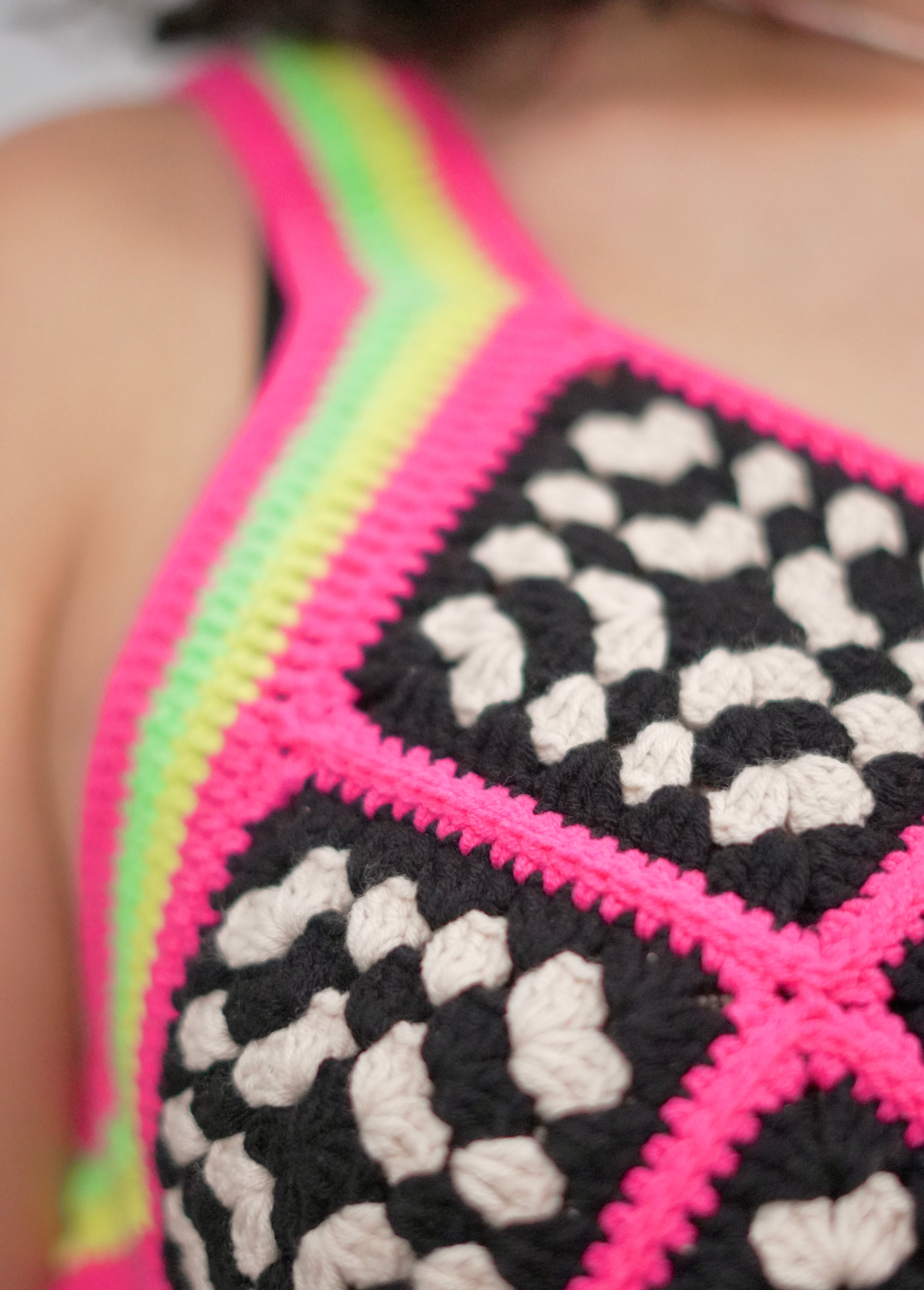 Bold and bright. The Viva  Top combines graphic black-and-white crochet with striking neon pink and green borders. A modern twist on a timeless handmade craft, designed to stand out wherever you go.