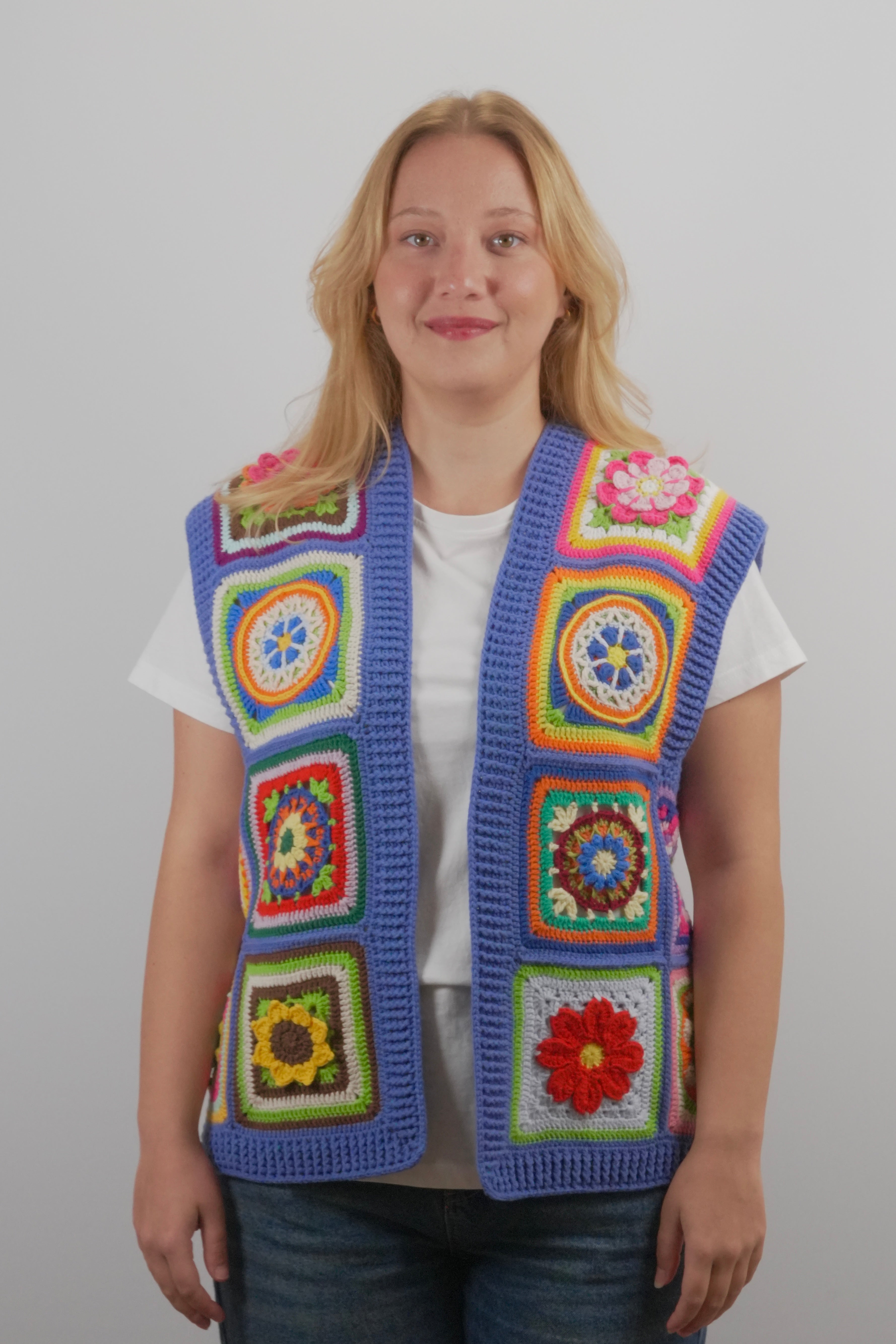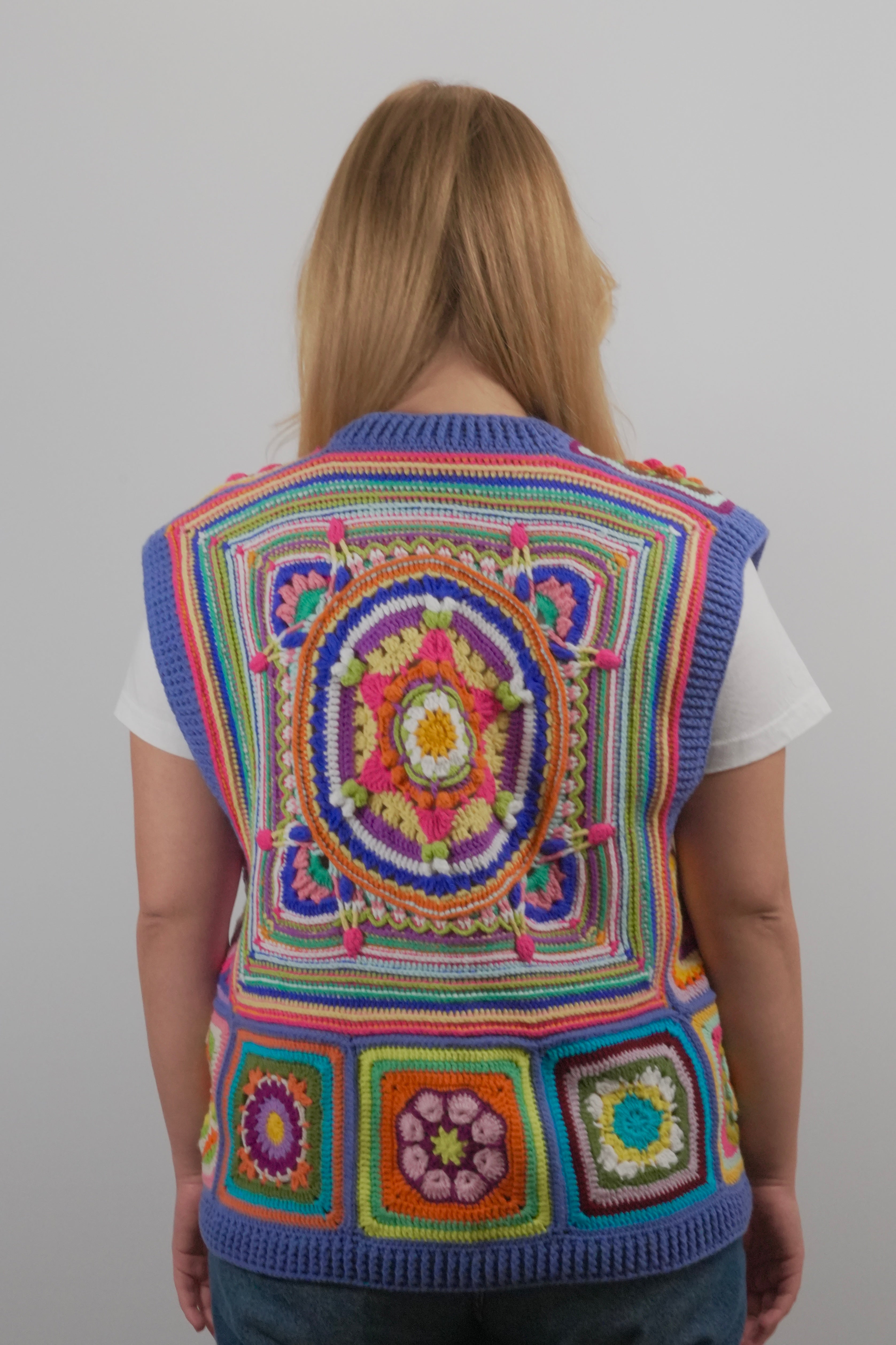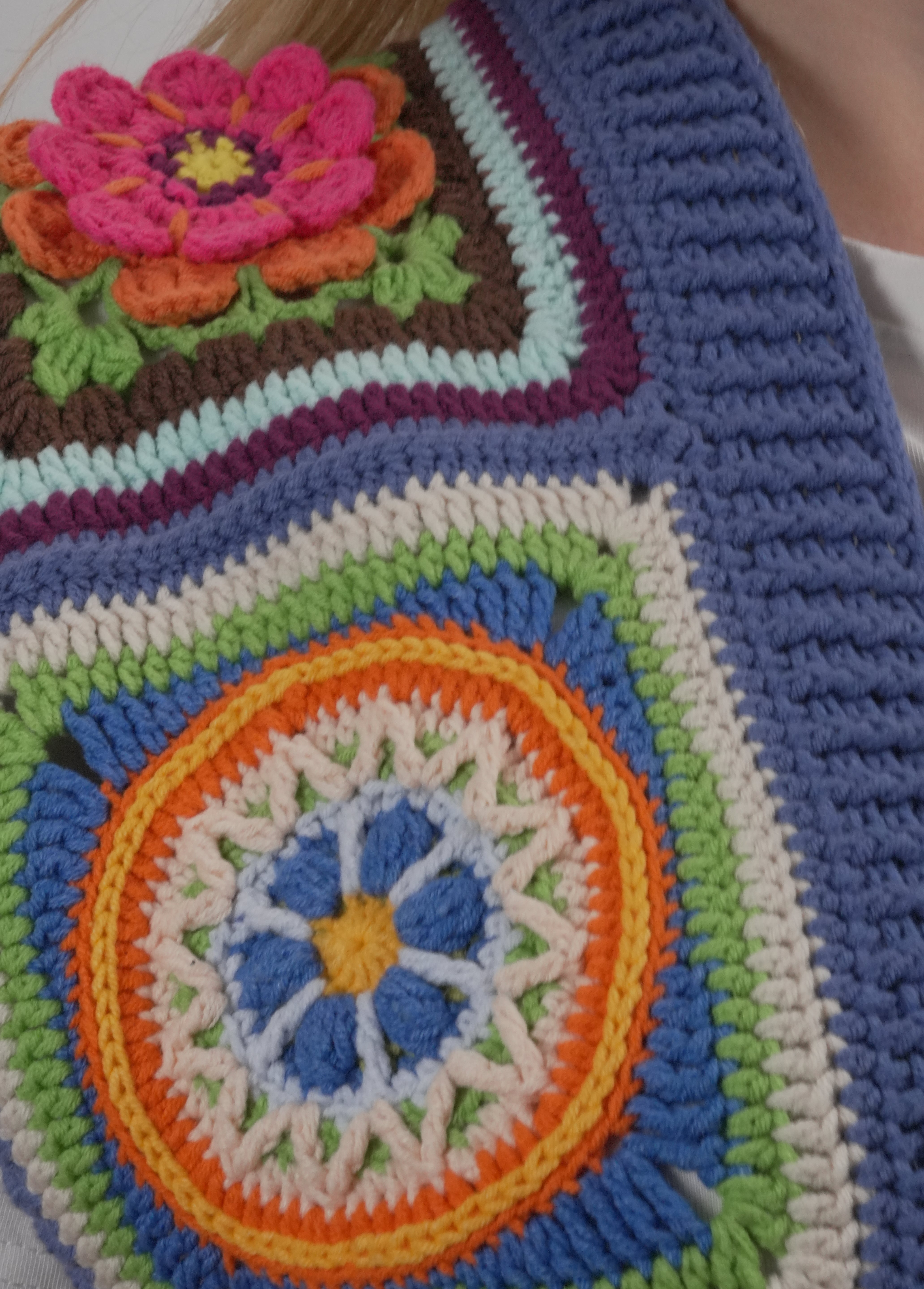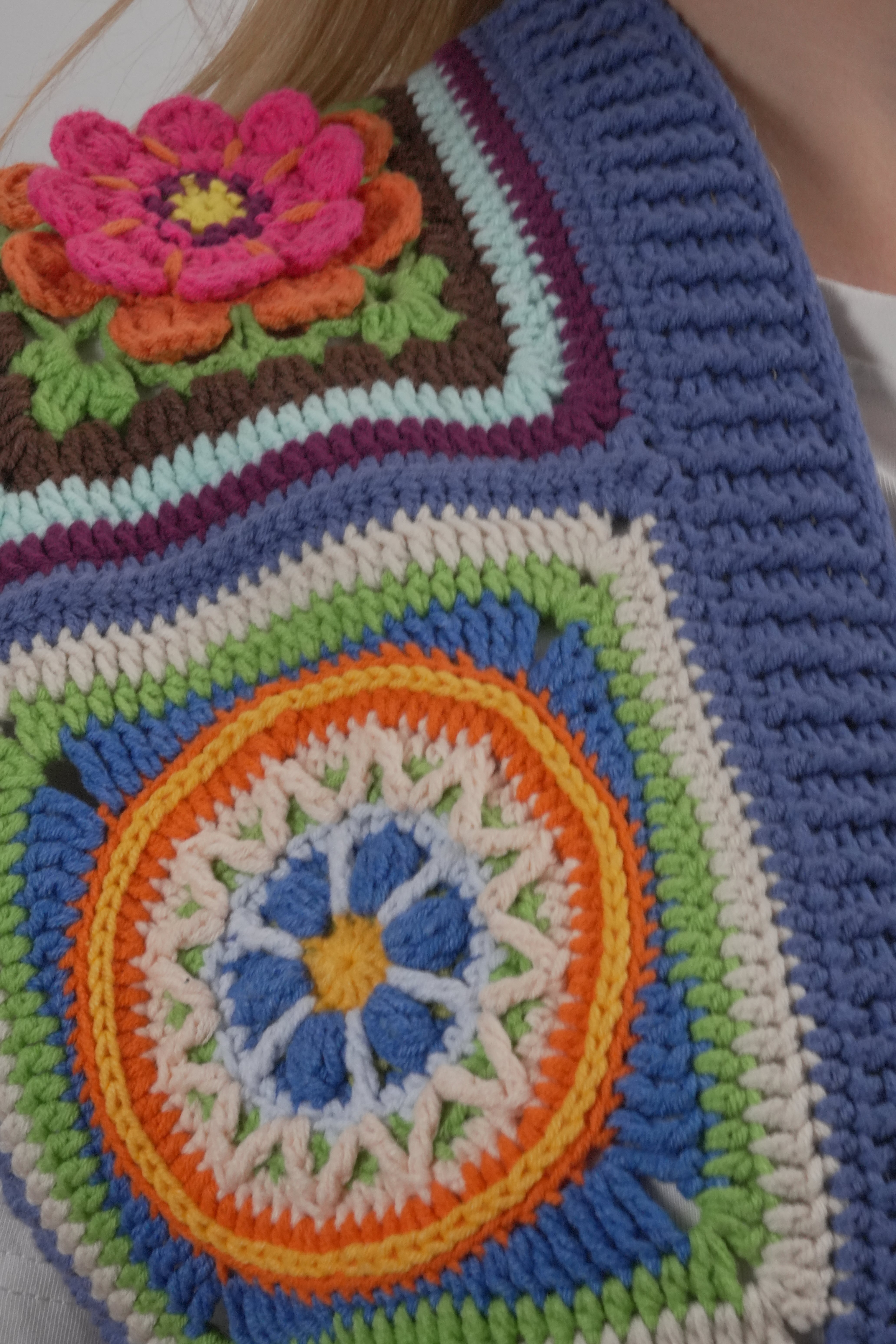 Celebrate colour, craft, and creativity. The Bloomia Vest is a joyful patchwork of vibrant crochet motifs on the front, crowned with a stunning statement medallion at the back. It’s bold, playful, and made to stand out.