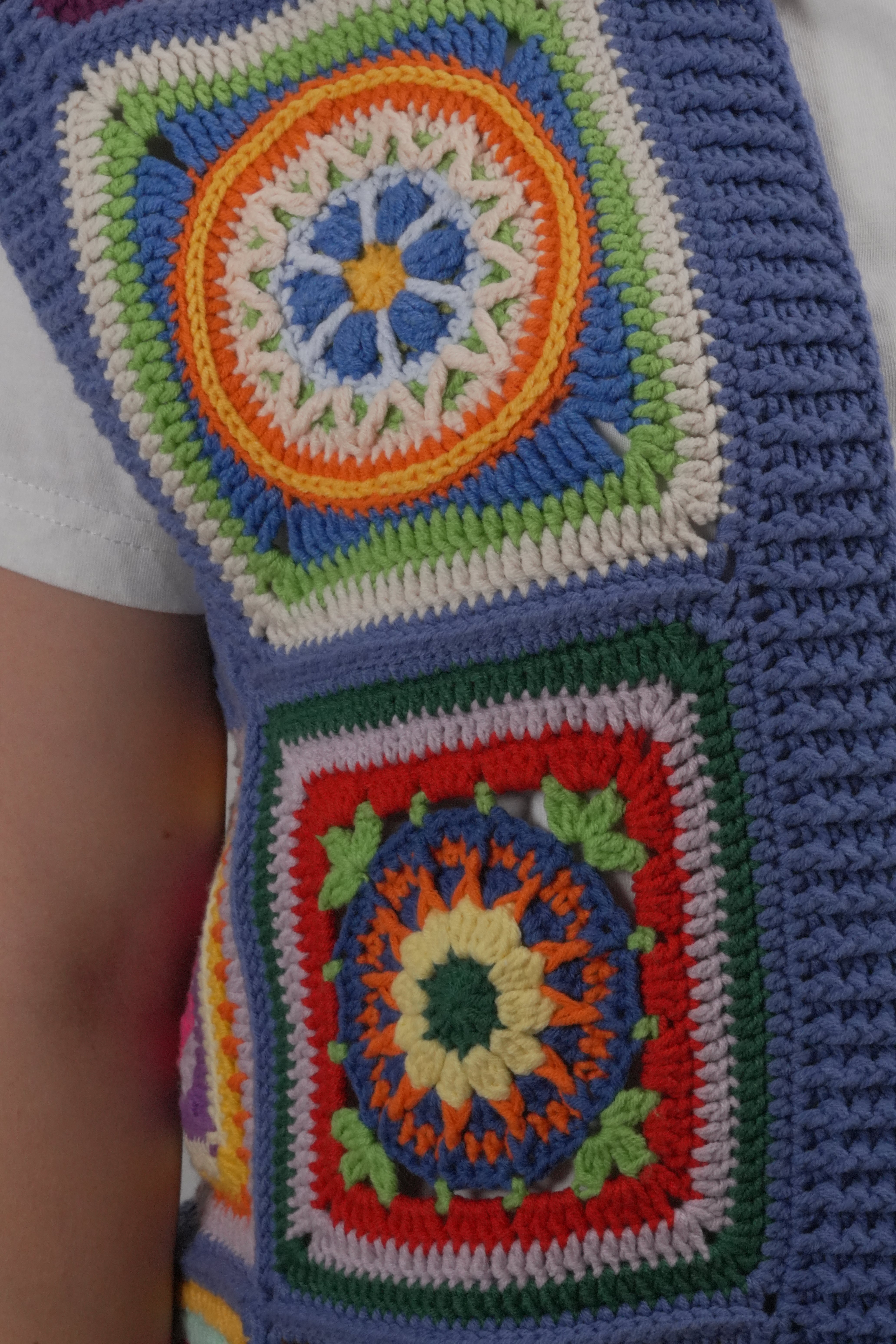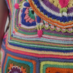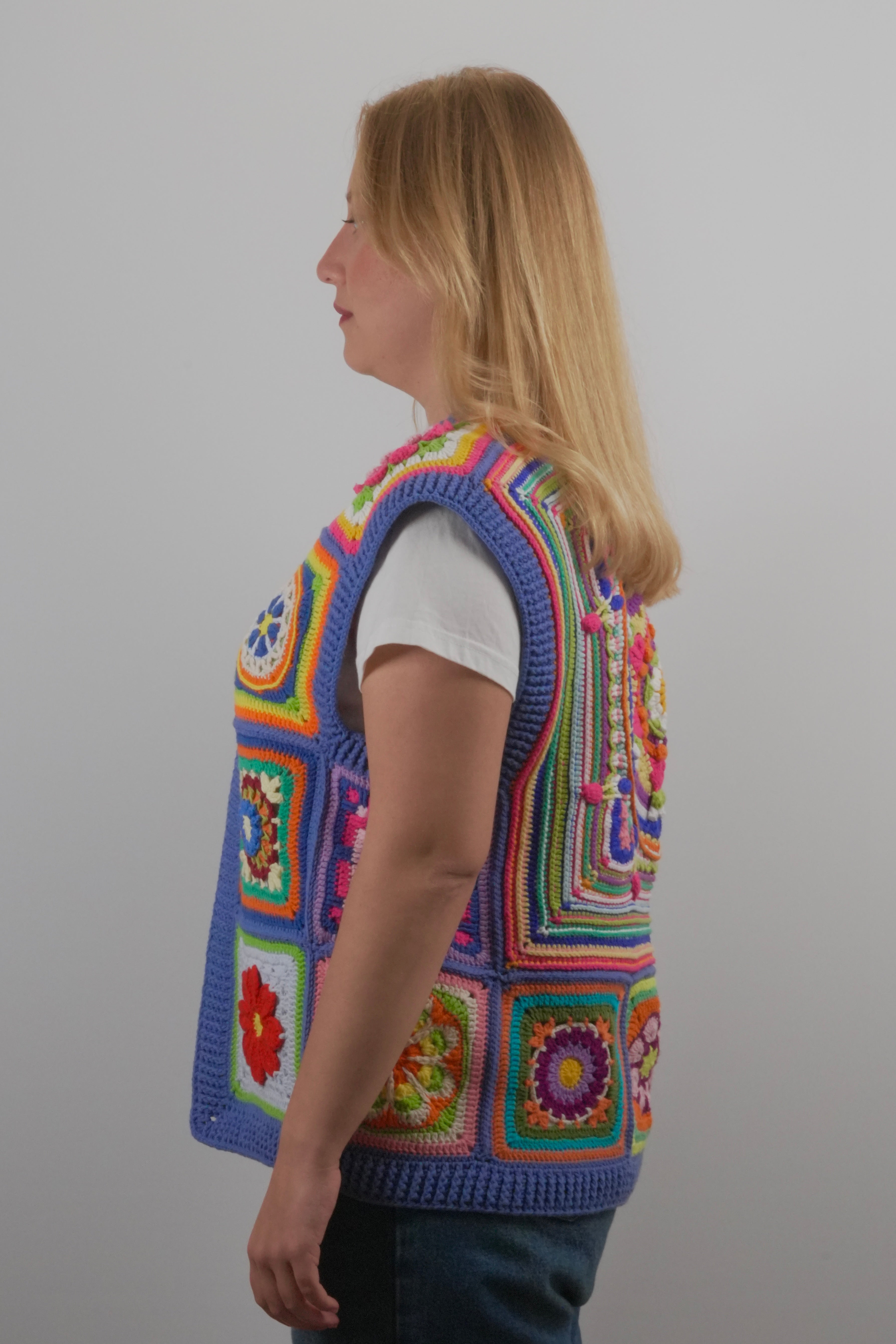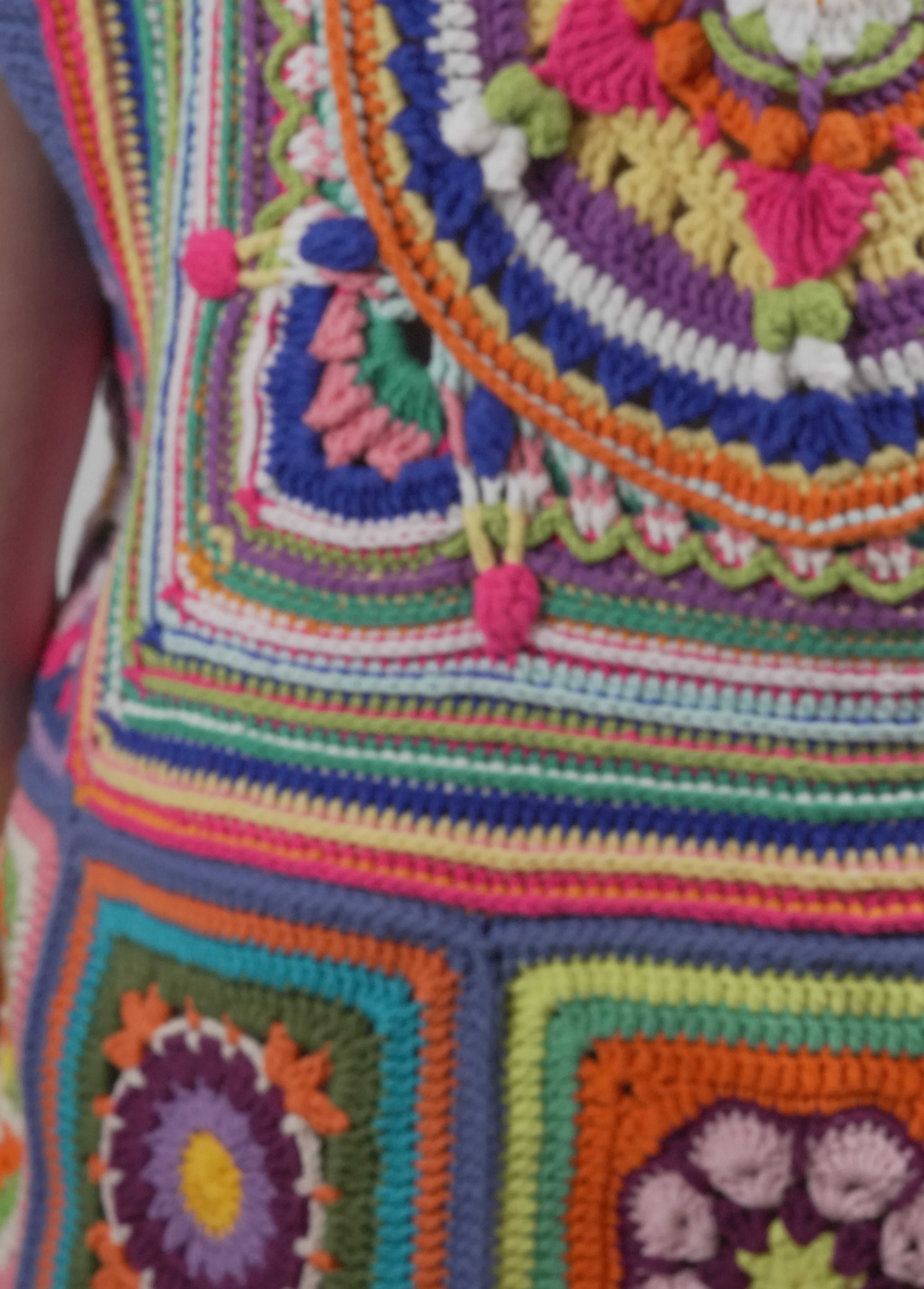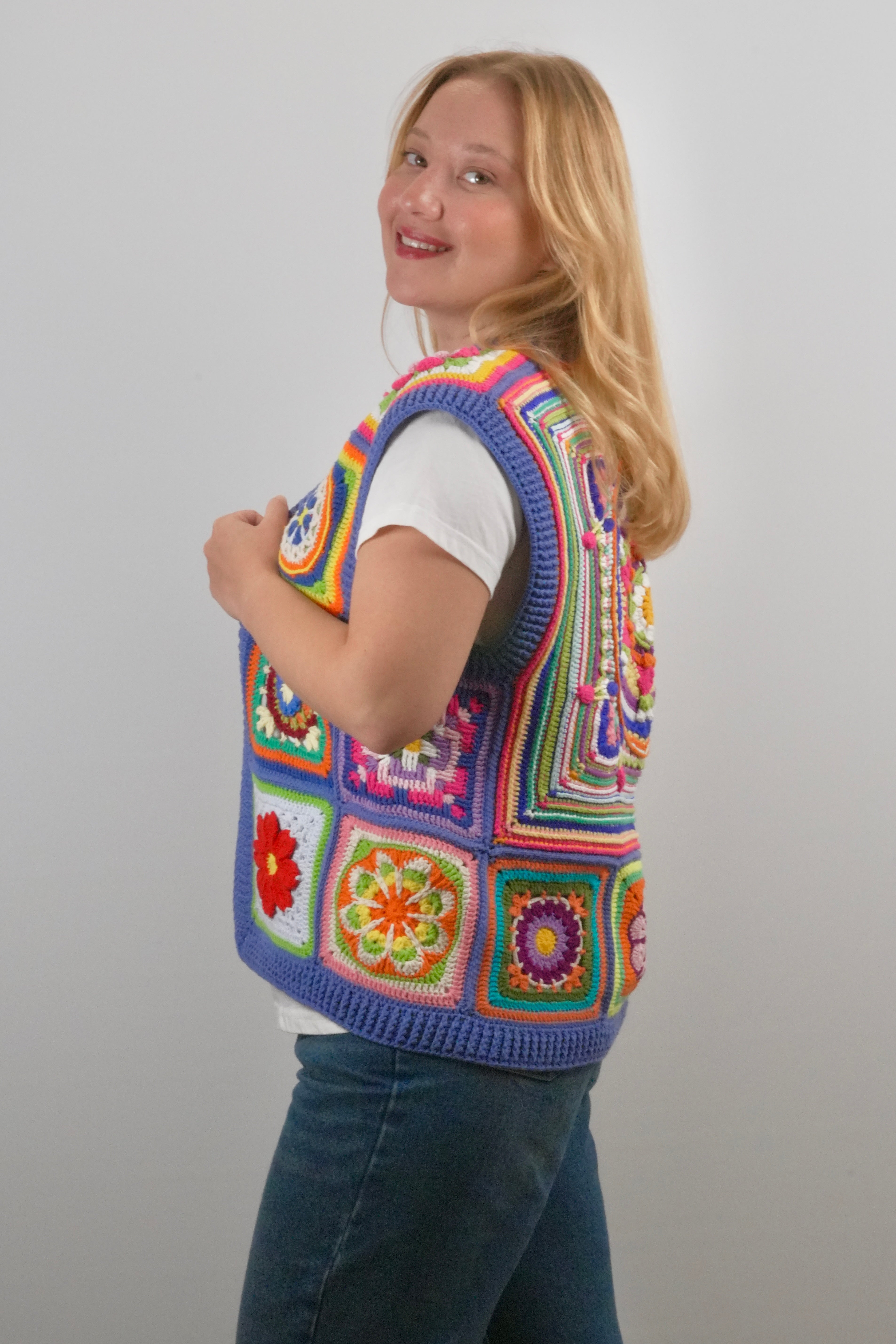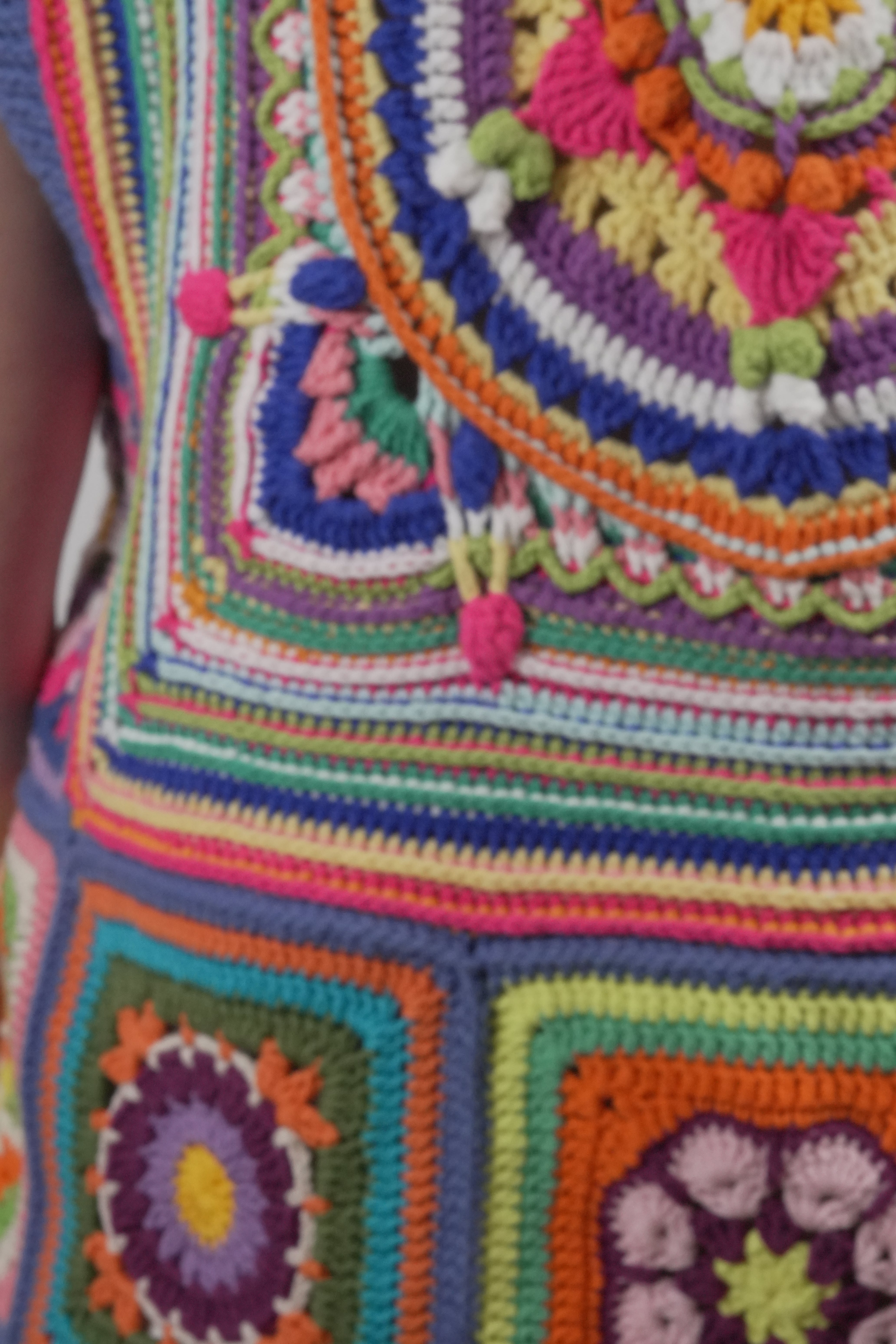 Celebrate colour, craft, and creativity. The Bloomia Vest is a joyful patchwork of vibrant crochet motifs on the front, crowned with a stunning statement medallion at the back. It’s bold, playful, and made to stand out.