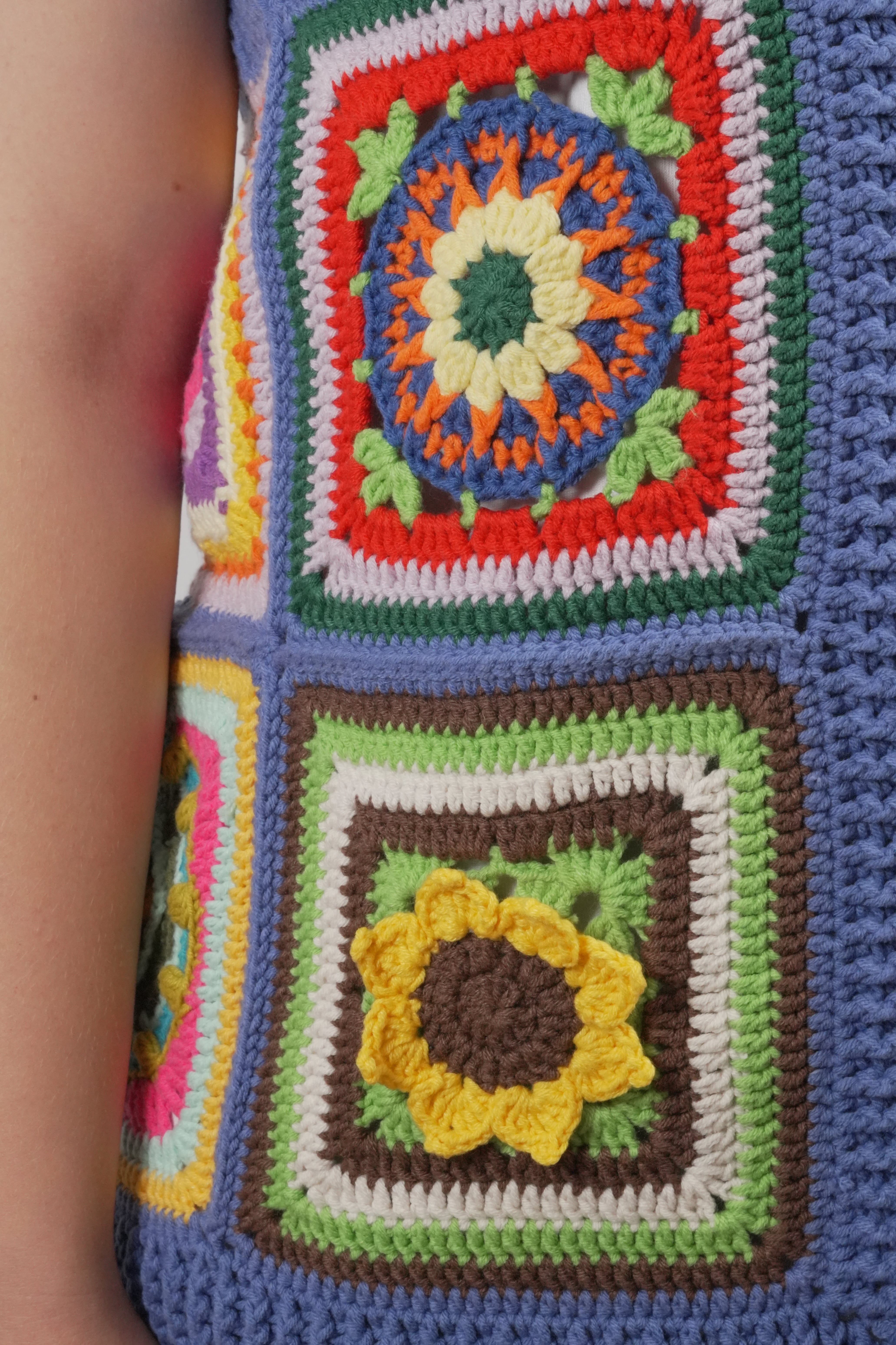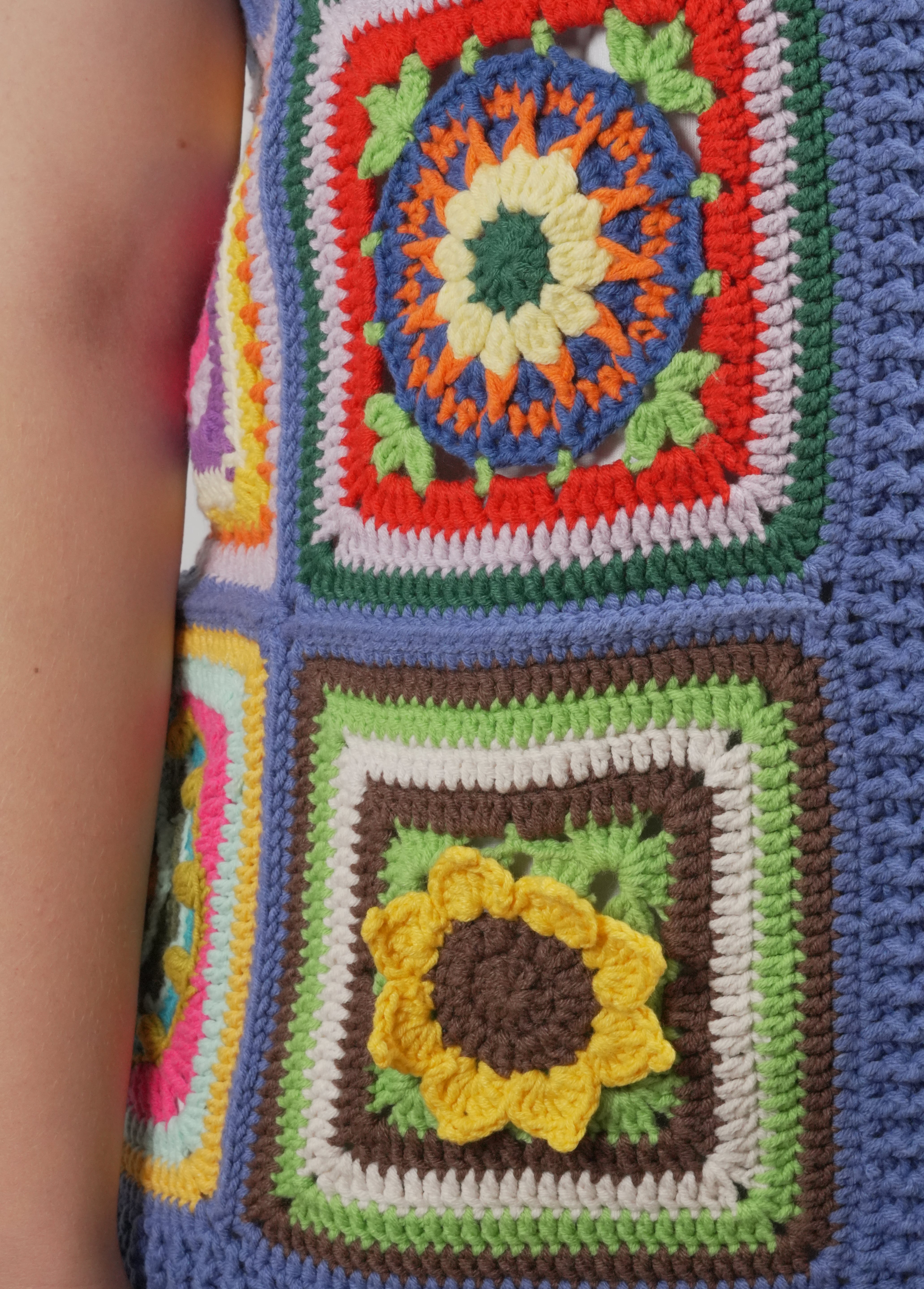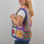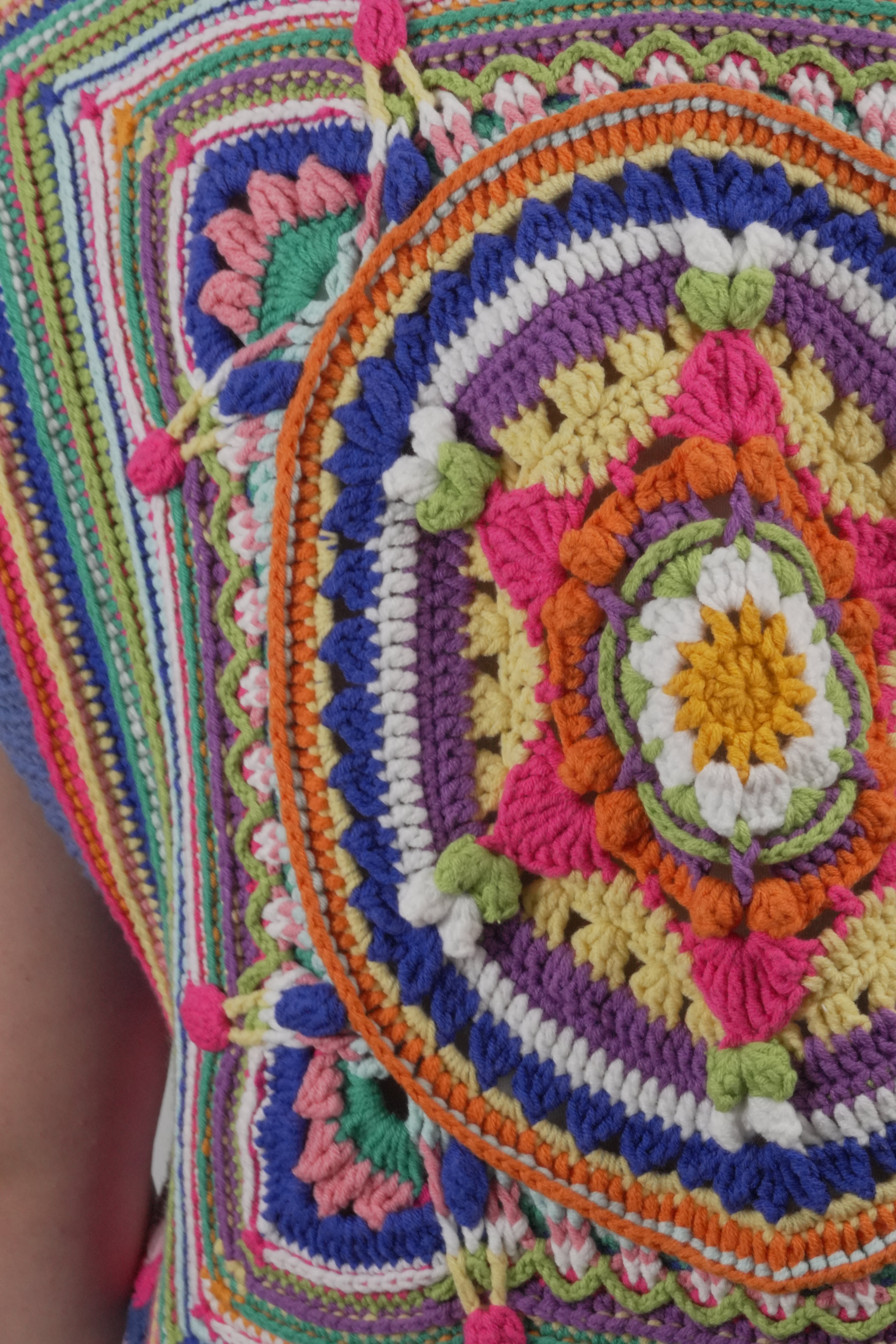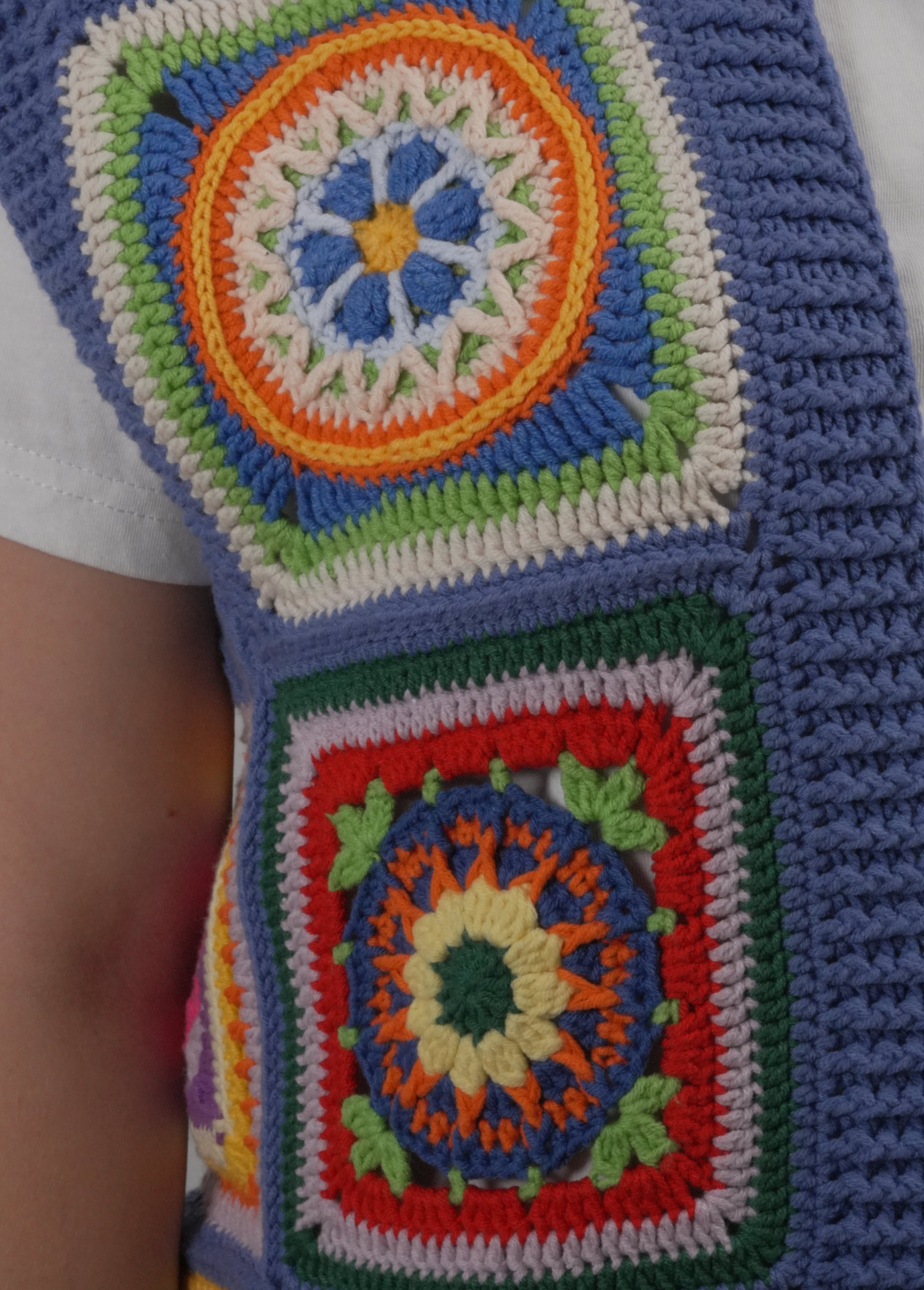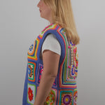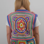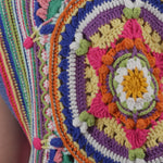 Celebrate colour, craft, and creativity. The Bloomia Vest is a joyful patchwork of vibrant crochet motifs on the front, crowned with a stunning statement medallion at the back. It’s bold, playful, and made to stand out.