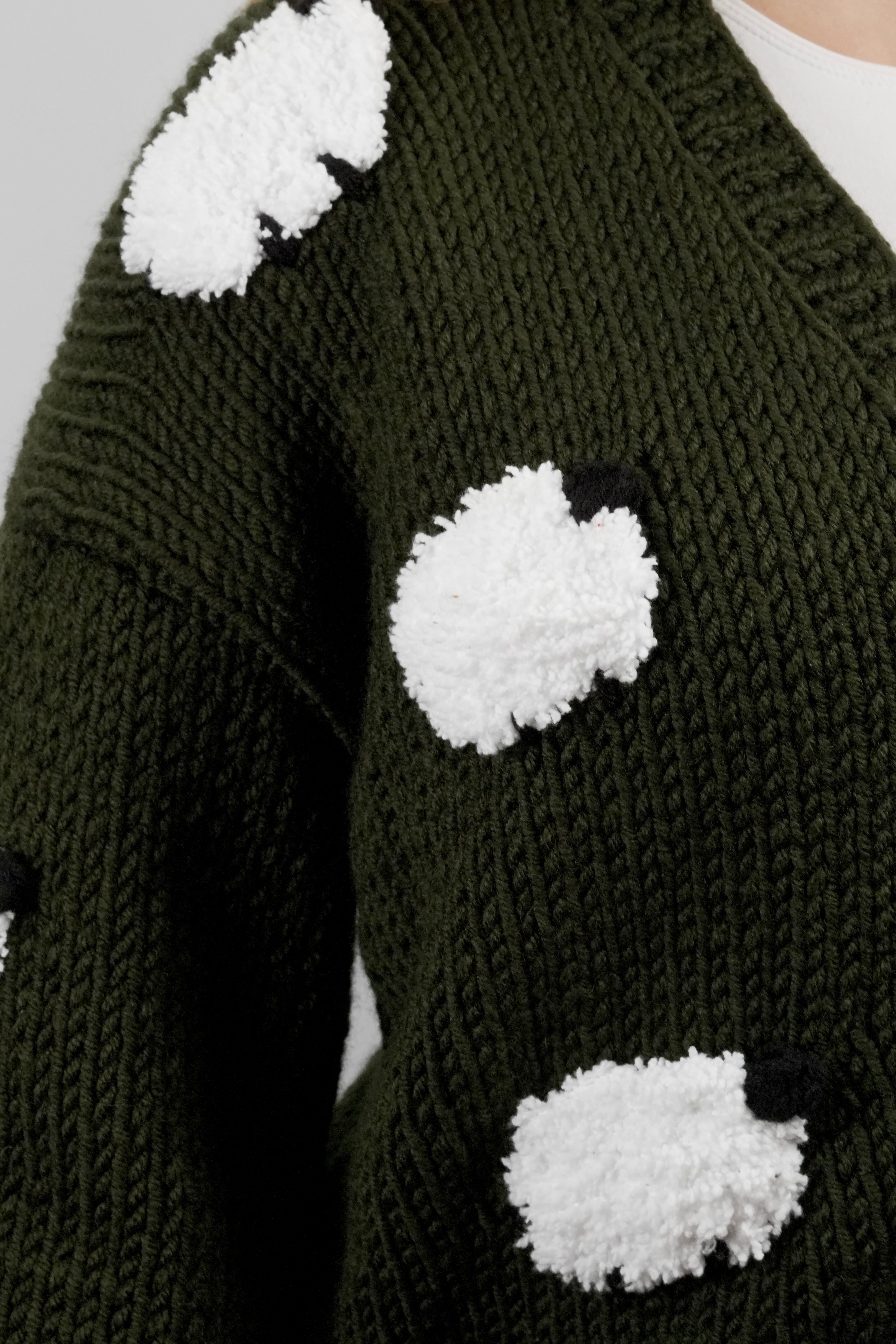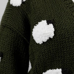 Cozy up in the playful charm of the Sheep Cardigan. Hand-knitted in deep forest green, this chunky cardigan is adorned with fluffy white sheep motifs that bring a touch of whimsy to your everyday look. Perfect for layering, it’s a piece that makes comfort feel fun.